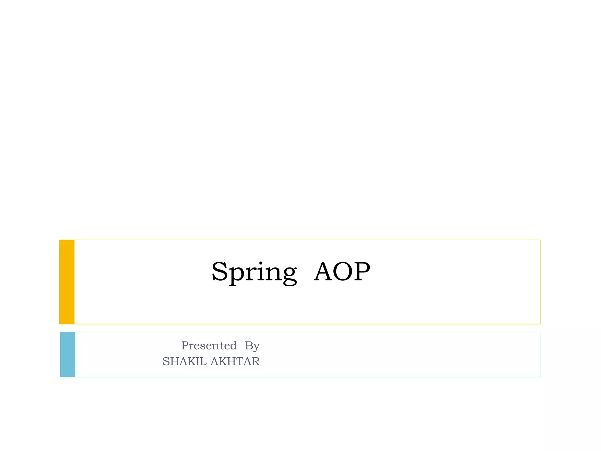 Spring AOP is presented to solve the problem of cross-cutting concerns. Core concepts include join points, pointcuts, advice, and aspects. Pointcuts define where advice executes, such as methods matching a signature. Advice includes before, after returning, after throwing and around advice. Aspects modularize concerns using pointcuts and advice. Spring AOP uses proxies to weave aspects at runtime.