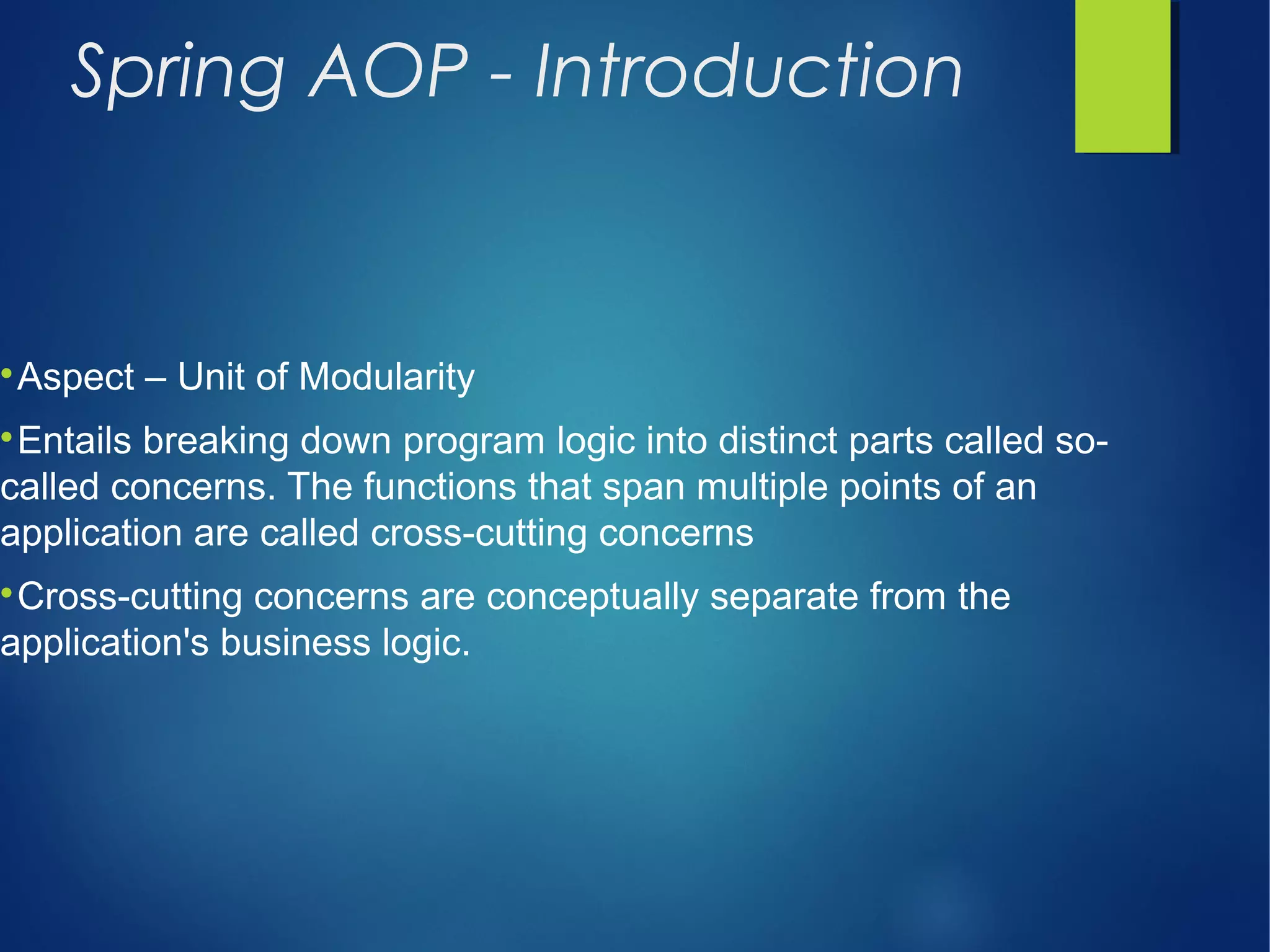 Spring AOP allows for aspect-oriented programming in Spring applications. It provides a way to separate cross-cutting concerns like logging, security and caching into reusable modules called aspects. Aspects define advices that specify actions to be taken at certain join points during execution of methods. The main AOP concepts are aspects, advices, join points, pointcuts and weaving. Advices like before, after, around etc allow code to run before, after or around method executions. Pointcuts define which method executions match, allowing advices to be selectively applied based on method signatures or argument types. Weaving is the process of integrating aspects into classes at compile-time, load-time or runtime.
