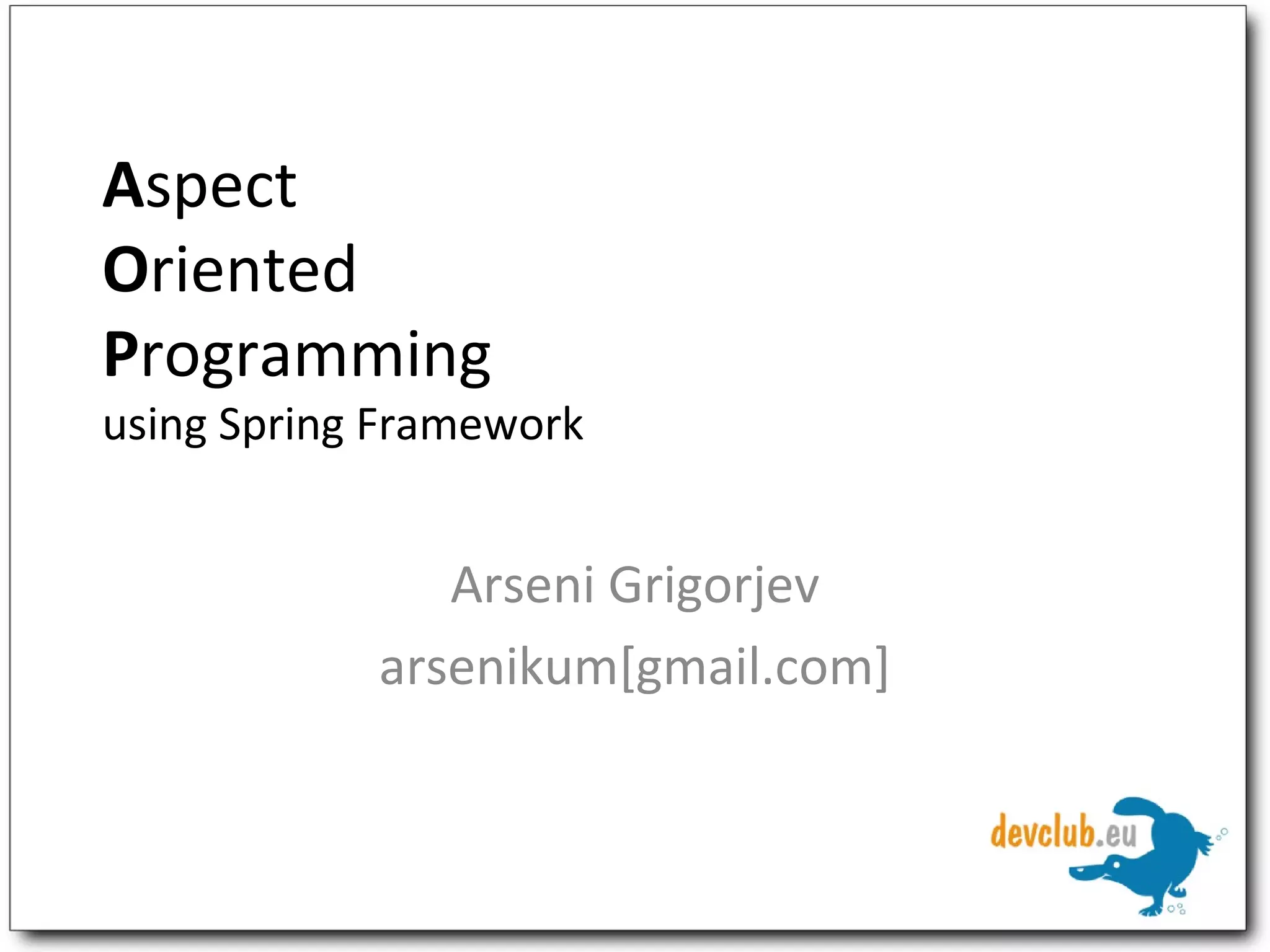 The document introduces aspect-oriented programming (AOP) using the Spring framework. AOP enables separating cross-cutting concerns like logging, caching, and error handling into modular aspects. Spring AOP uses dynamic proxies to advise Spring beans by adding aspects without modifying code. It provides an example of adding performance tracing to a service method using an aspect configured as a Spring bean.