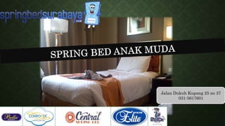 Dokumen ini menawarkan berbagai pilihan spring bed berkualitas dengan harga terbaru dan terlengkap, tersedia di www.springbedsurabaya.com. Lokasi toko berada di Jalan Dukuh Kupang 25 No 37, dengan informasi kontak yang disertakan. Juga terdapat berbagai merek dan model termasuk kasur untuk anak-anak.