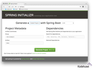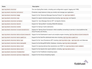 Spring Boot is a framework that makes it easy to create stand-alone, production-grade Spring based applications that you can "just run". It allows you to create stand-alone applications, embed Tomcat/Jetty directly with no need to deploy WAR files, and provides starter POMs to simplify configuration. Spring Boot applications are run by adding a spring-boot-gradle-plugin and can then be run as an executable JAR. Features include REST endpoints, security, external configuration, and production monitoring via Actuators.