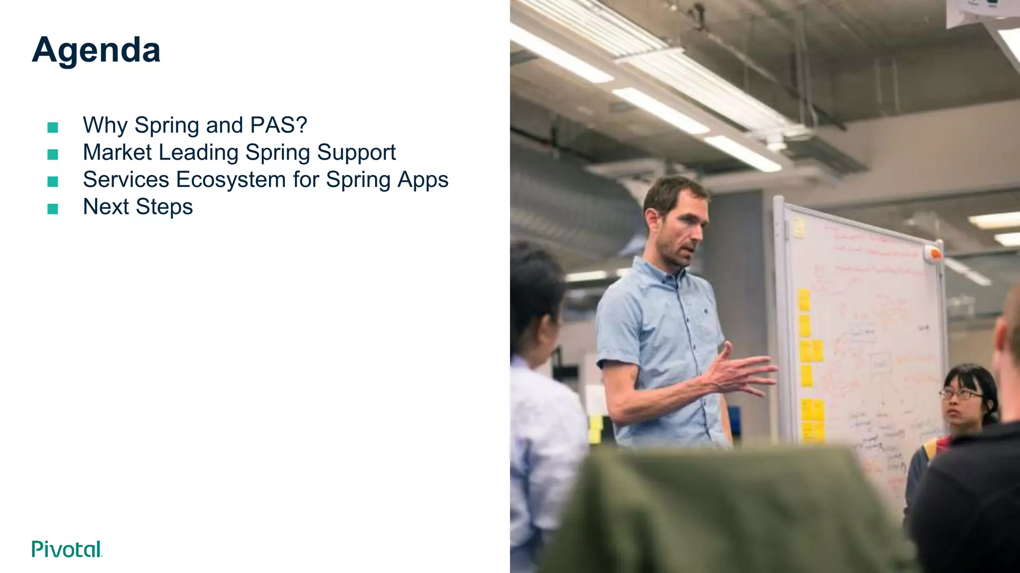 The document provides an overview of Pivotal's Spring and Pivotal Application Service (PAS), emphasizing market-leading support and a robust ecosystem for developing cloud-native applications. It includes insights into developer time allocation for coding and operations, various services offered for Spring apps, and the advantages of using Spring frameworks for building microservices. The document also highlights next steps for engagement and exploration of Pivotal's offerings.