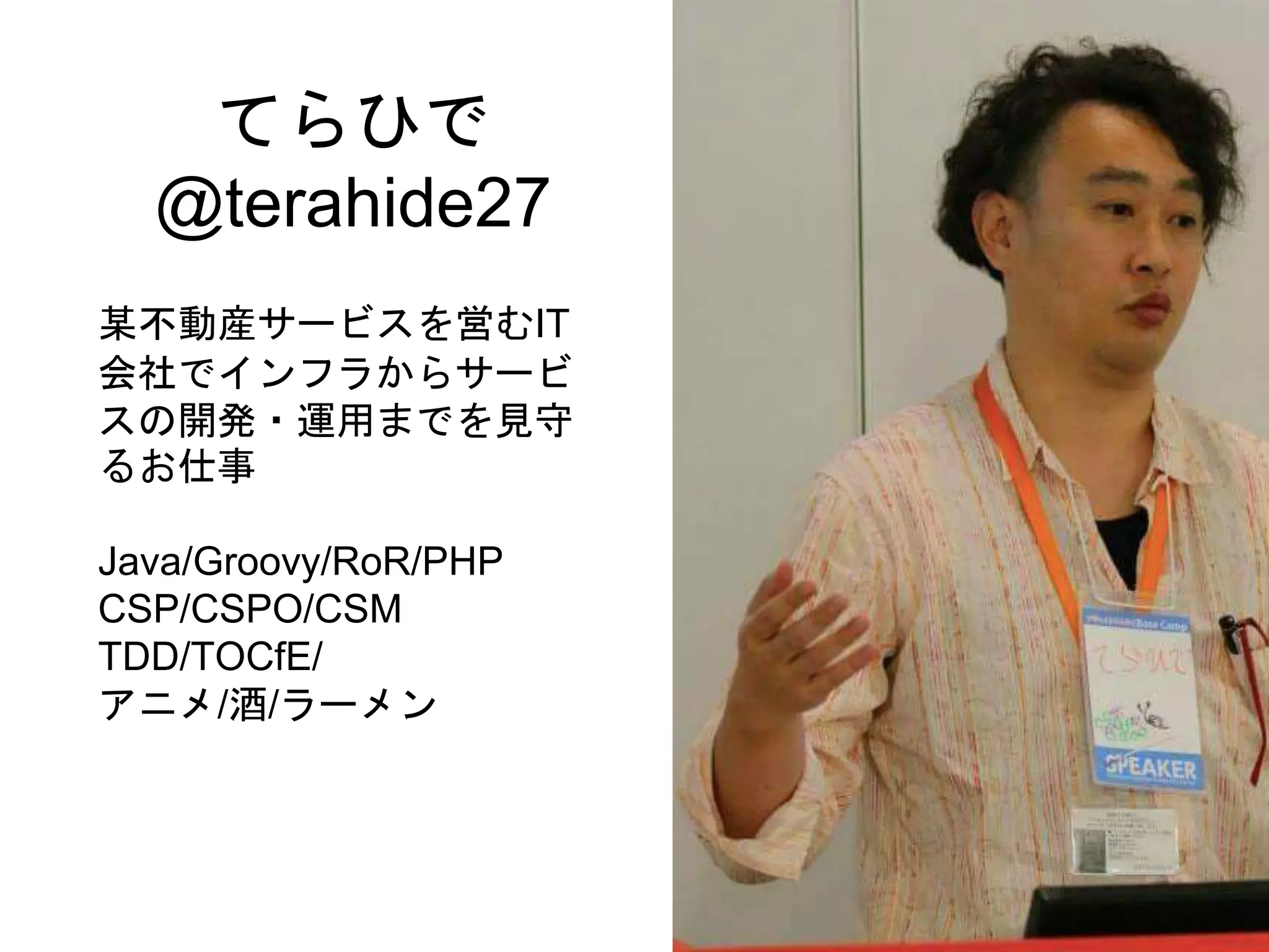 てらひで @terahide27 某不動産サービスを営むIT 会社でインフラからサービ スの開発・運用までを見守 るお仕事 Java/Groovy/RoR/PHP CSP/CSPO/CSM TDD/TOCfE/ アニメ/酒/ラーメン