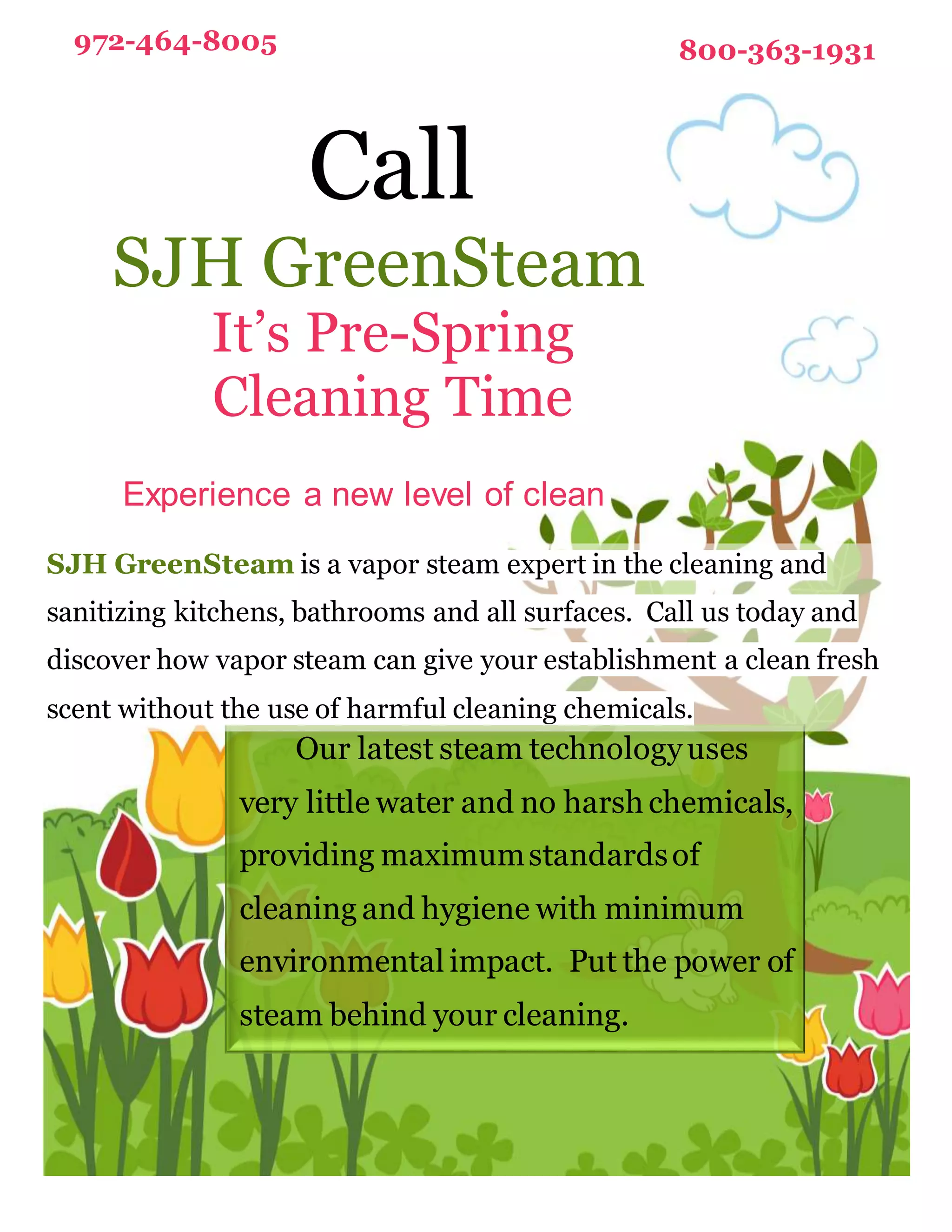 SJH GreenSteam provides steam cleaning services for kitchens, bathrooms and other surfaces using new technology that requires little water and no harsh chemicals, giving a deep clean with minimal environmental impact. They are experts in vapor steam cleaning that sanitizes areas while leaving a fresh scent without using potentially harmful chemicals, and encourage calling their numbers to learn how steam can clean your establishment.
