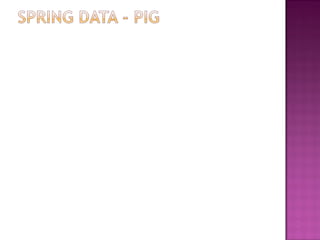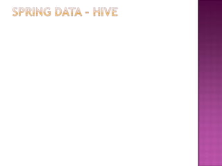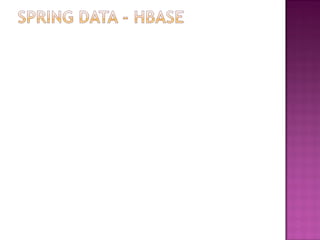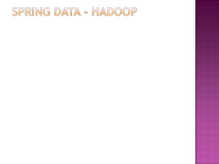 The document discusses using Spring for Apache Hadoop to configure and run MapReduce jobs, Hive queries, Pig scripts, and interacting with HBase. It provides examples of configuring Hadoop, Hive, Pig, and HBase using Spring namespaces and templates. It demonstrates how to declare MapReduce jobs, run Hive queries and Pig scripts, and access HBase using the HBaseTemplate for a higher level of abstraction compared to the native HBase client.