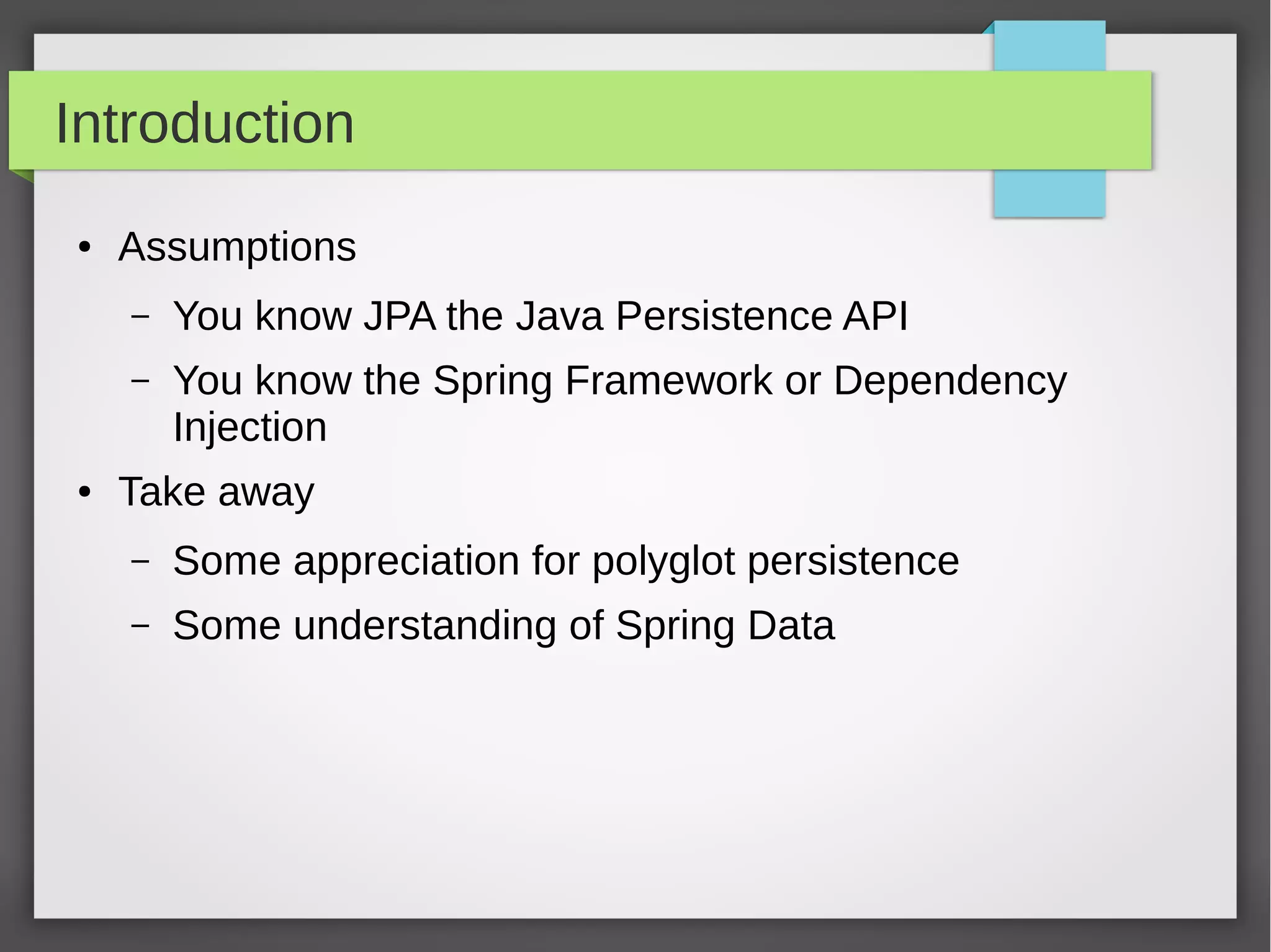 Spring Data provides a common data access layer for various data stores like MongoDB, JPA, Neo4J, and Redis. It simplifies polyglot persistence through repositories that provide common CRUD methods. Developers define entities specific to the data store and a repository interface with finder methods. Spring Data generates an implementation that interacts with the underlying data store transparently. This allows writing data access code that is portable across data sources.