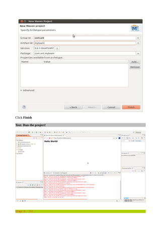 This document provides a step-by-step guide to integrating Spring, Hibernate, JSF, and PrimeFaces in a Java web application. It describes setting up the technologies and dependencies, configuring the application context and data source, adding entity classes and DAOs, and testing each step. The 5 steps include setting up Maven and JSF, adding PrimeFaces, integrating Spring, and finally connecting to a PostgreSQL database using Hibernate.