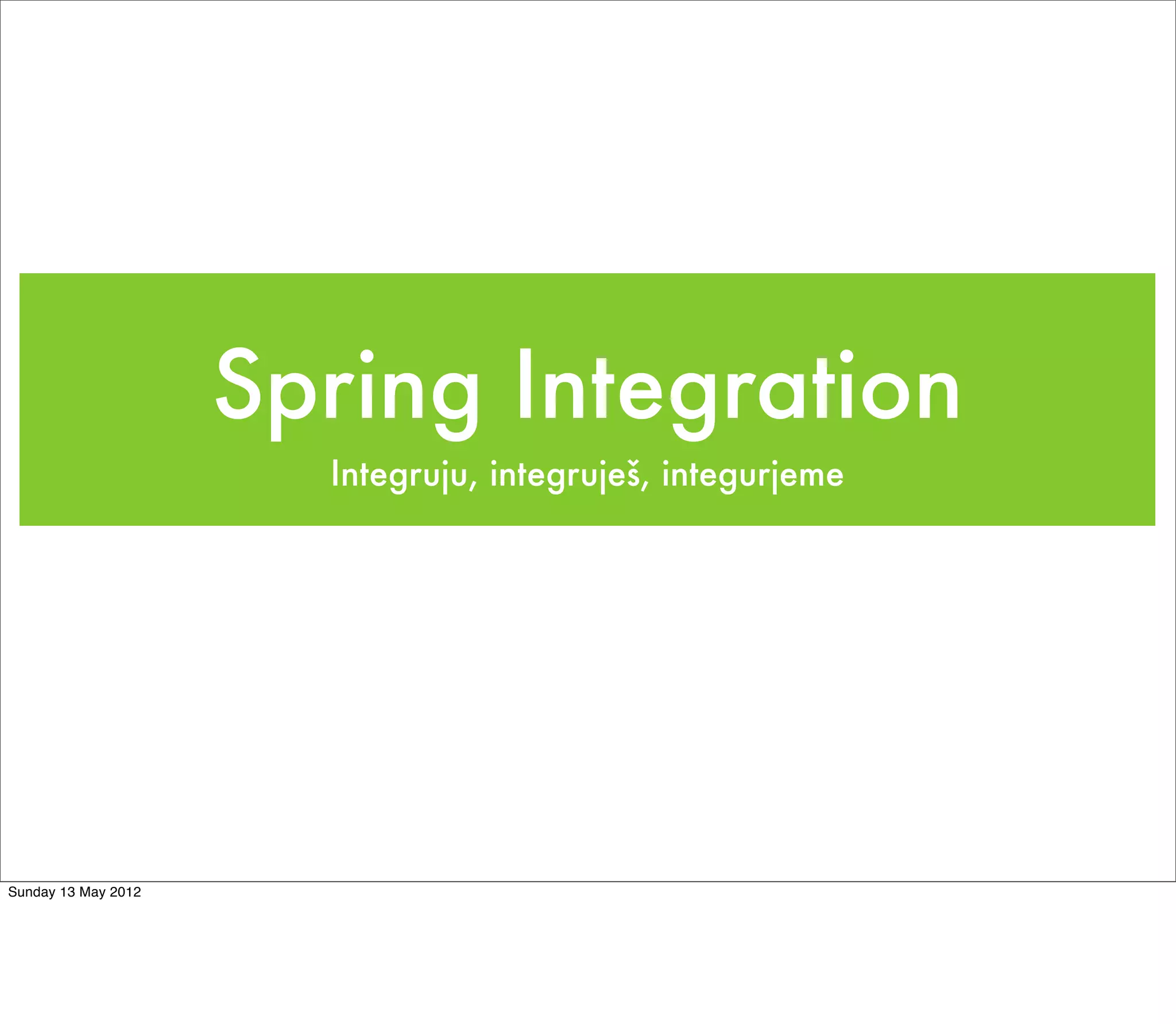 This document provides an overview of the Spring Integration framework. It discusses key concepts like channels, endpoints, routers, filters and transformers. It describes common integration scenarios like file transfer, database integration and messaging. The goals of Spring Integration are to provide a simple model for complex enterprise integration and facilitate asynchronous, message-driven behavior within Spring applications. An example demonstrates converting a message to uppercase using a service activator and channels.