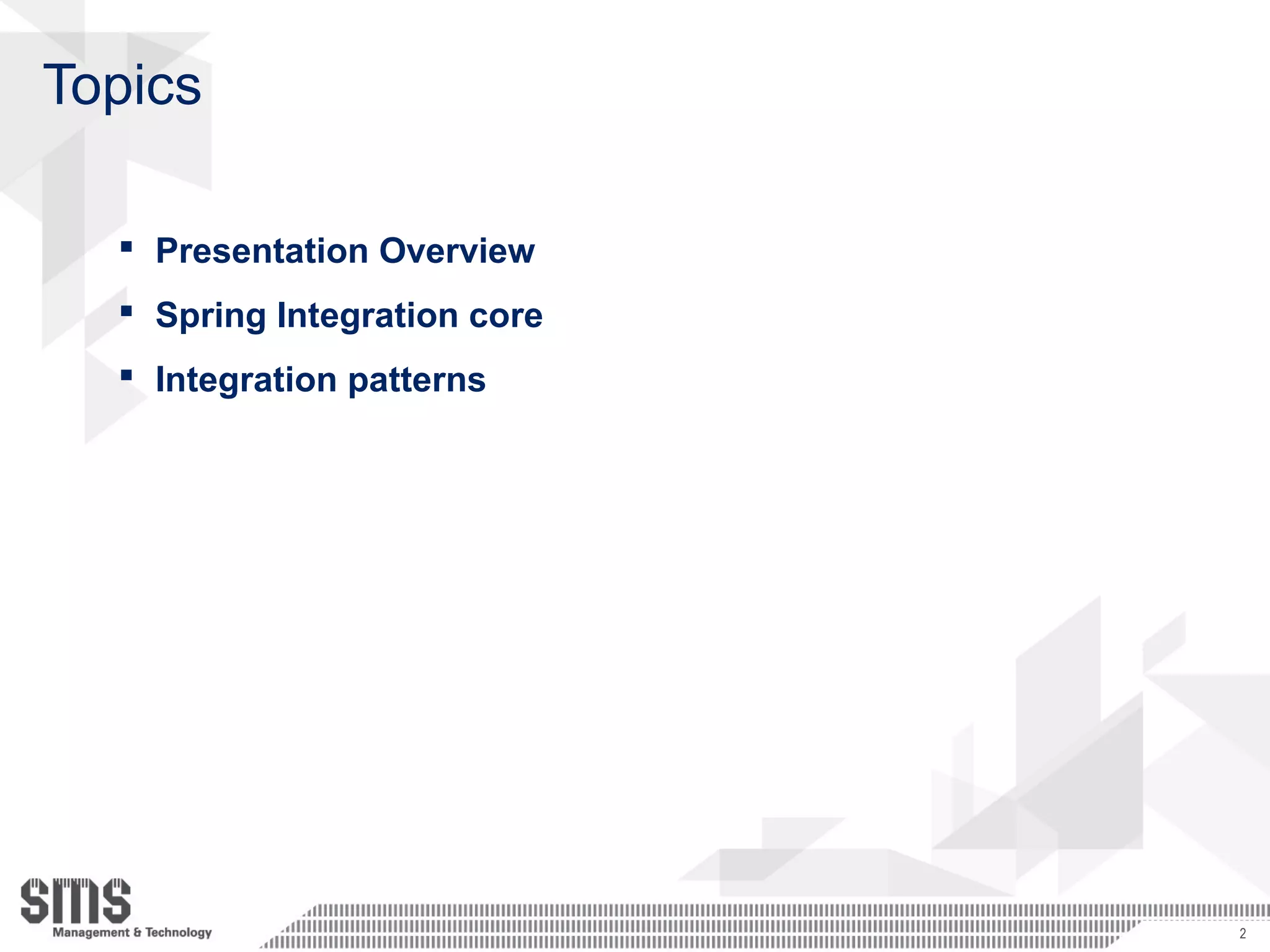 The document summarizes a presentation on Spring Integration, a framework for building message-driven applications. It introduces core concepts like channels, messages and endpoints. It also outlines features like loose coupling, content-based routing and transformation capabilities. The presentation includes a demo of patterns like the splitter-aggregator and uses various adapters including JMS, file system and web services. It promotes a lightweight, message-driven integration design and configuration with dependency injection.