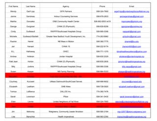 This document contains a list of names, agencies, phone numbers, and emails. There are over 100 people listed from various health, social service, and community organizations in Southeastern Massachusetts. The list includes representatives from hospitals, health centers, government agencies, non-profits, and businesses.