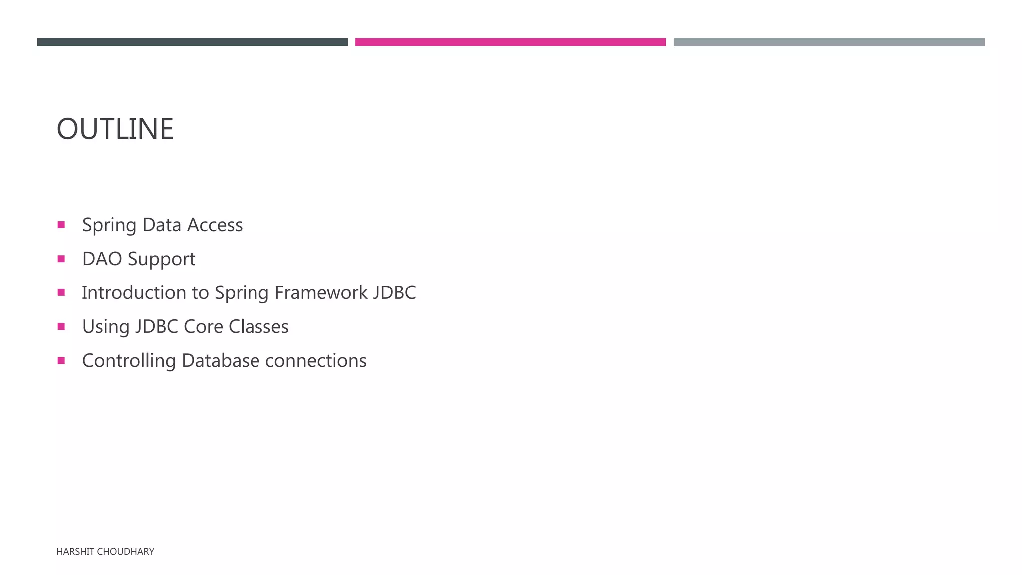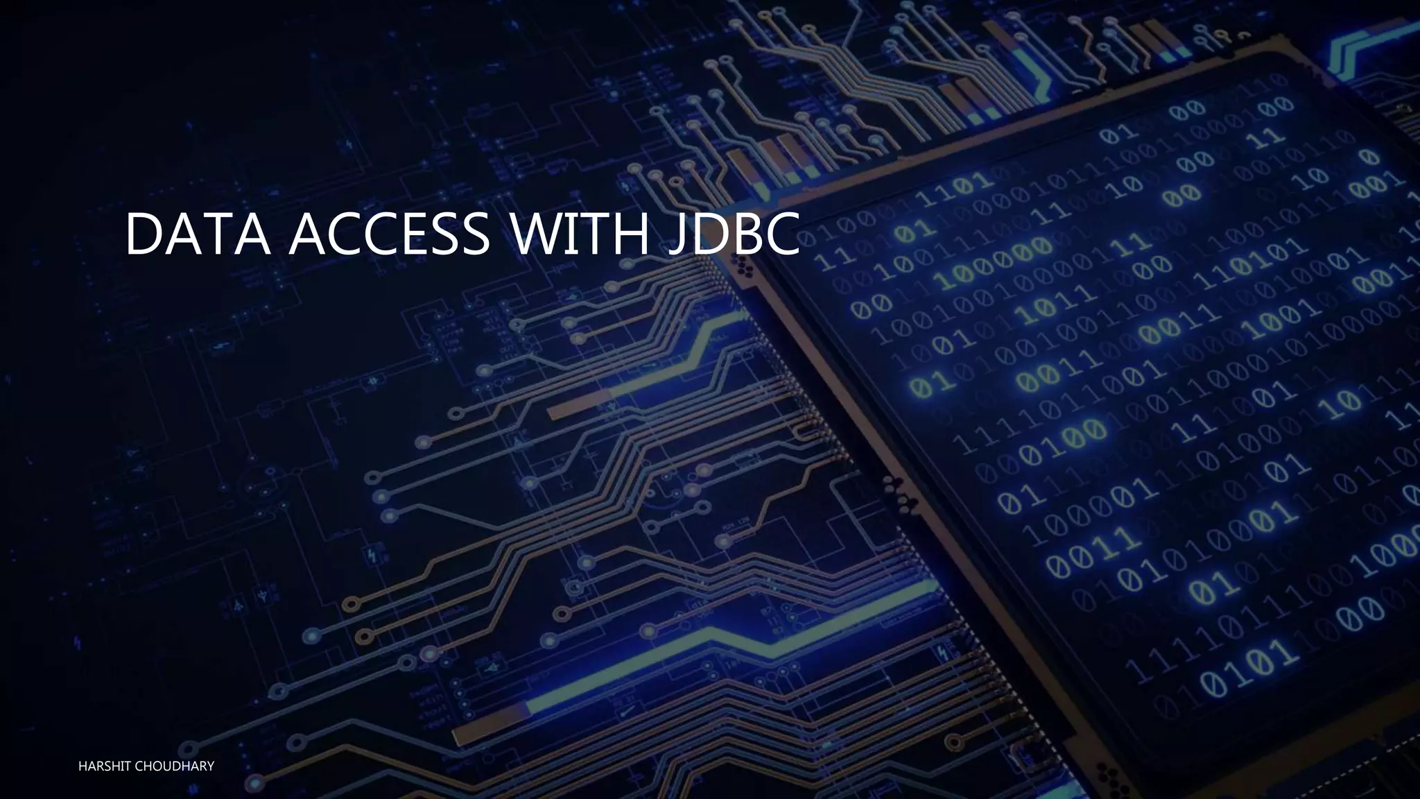 This document discusses data access with JDBC using the Spring Framework. It covers Spring's DAO support, exception handling, and approaches for database access including JdbcTemplate, NamedParameterJdbcTemplate, and controlling connections through a DataSource. The core classes provided by Spring simplify JDBC usage and handle common database tasks like opening/closing connections and transactions.