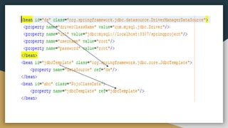 The document provides an overview of configuring Spring's JDBC Data Access Object (DAO) framework, detailing steps for setting up a data source, JDBC template, and custom DAO classes. It explains different types of data sources such as driver-based, JNDI, and pooled data sources, highlighting their advantages and use cases. Additionally, it discusses how to utilize JDBC templates to simplify database operations and manage resources more effectively in a Spring application.