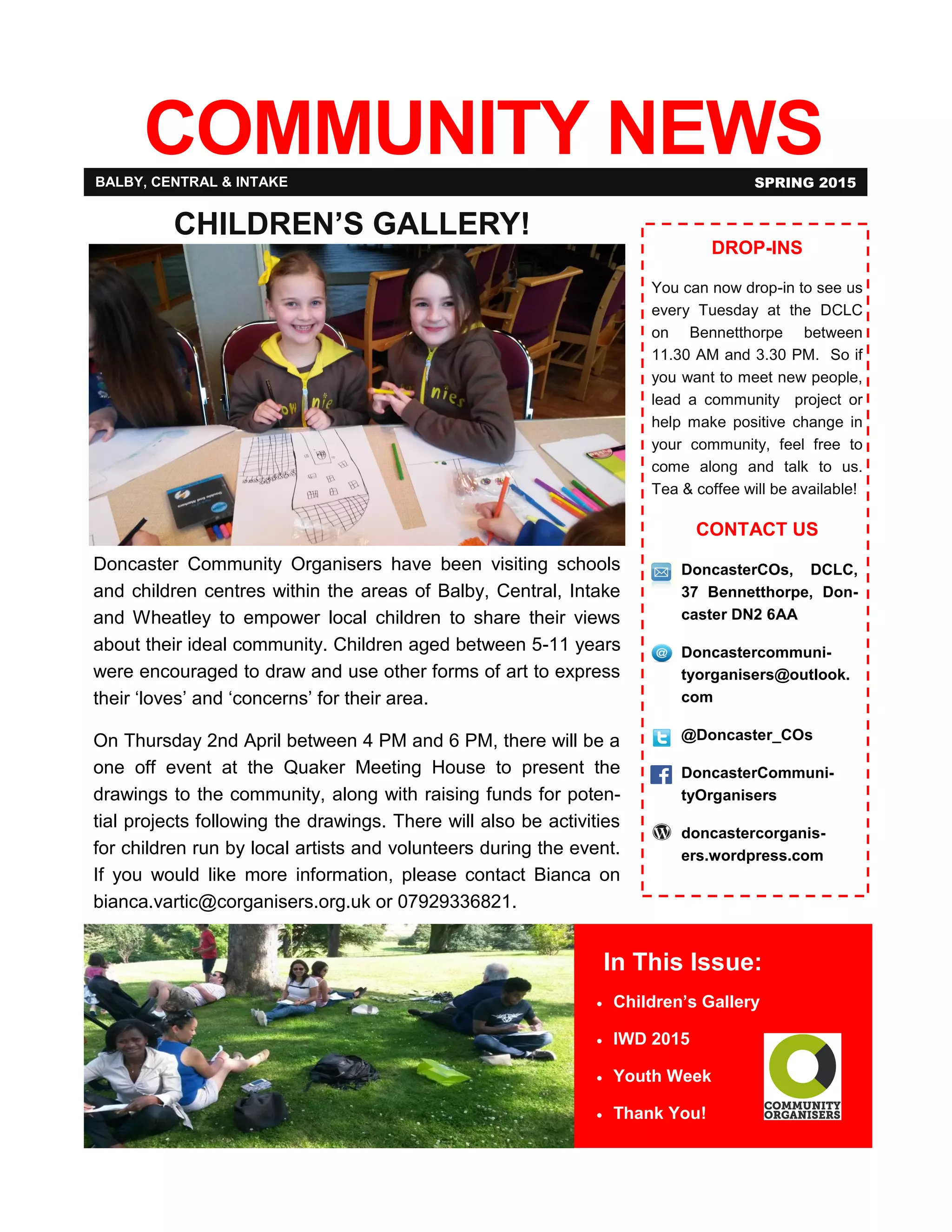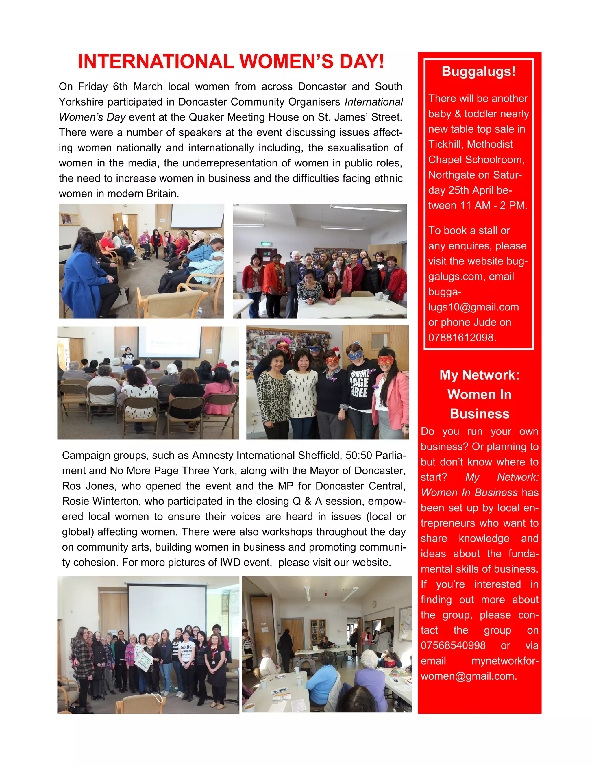 This community newsletter provides information on upcoming local events and opportunities for community involvement in Doncaster, England. It announces that children's artwork exploring their visions for the community will be displayed at an upcoming event. It also promotes International Women's Day events, multicultural workshops, and opportunities to get involved in a youth film project and women's business group. At the end, it thanks two community organizers for their work over the past year.