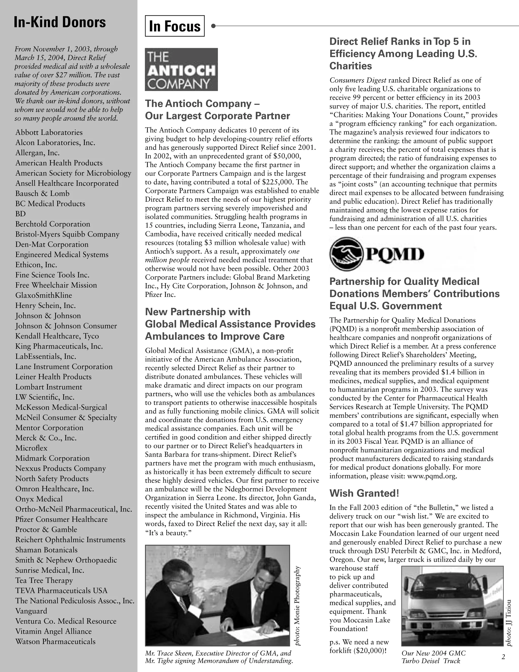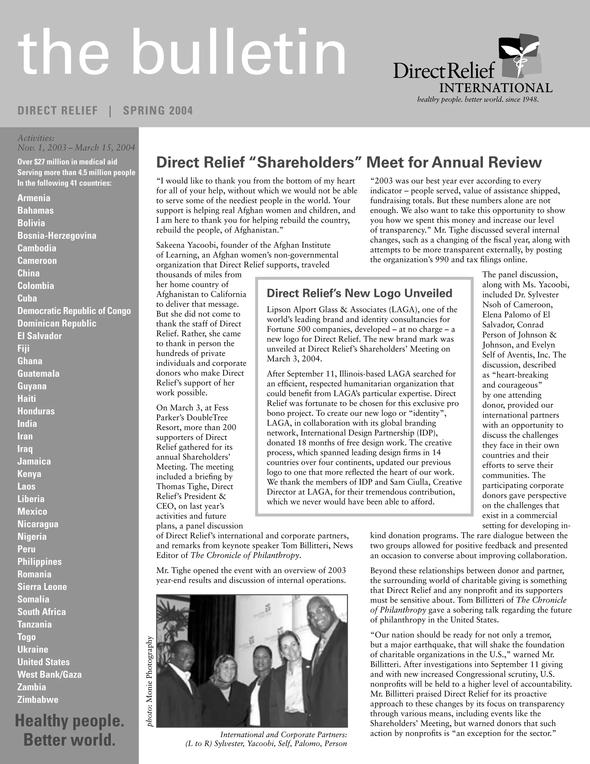 Direct Relief provided over $27 million in medical aid to more than 4.5 million people in 41 countries from November 2003 to March 2004. At its annual Shareholders' Meeting, Direct Relief discussed its activities over the past year and plans for the future. Direct Relief also recognized its international and corporate partners for their contributions and support.