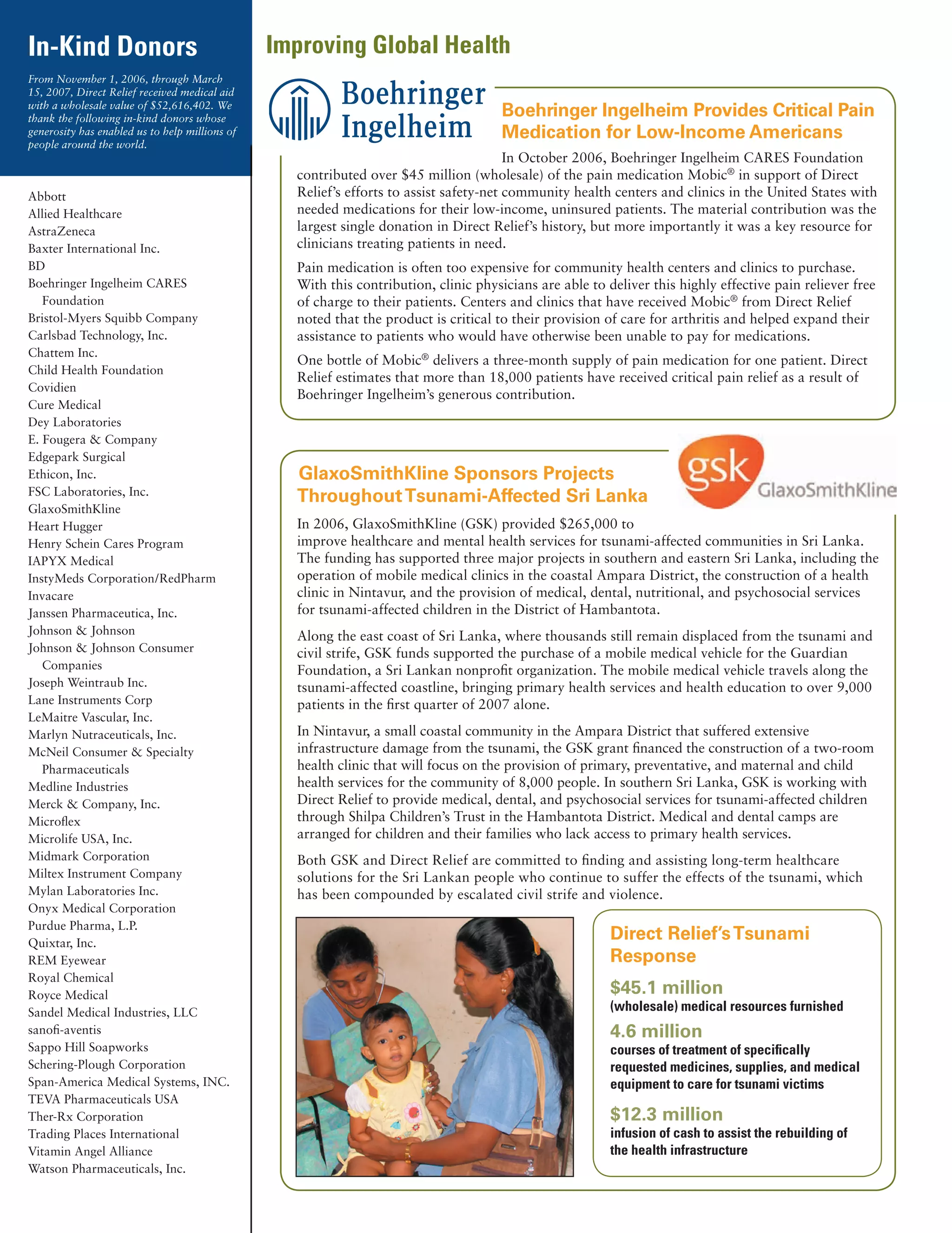 Direct Relief partnered with clinics nationwide to distribute 500,000 asthma inhalers donated by a pharmaceutical company to low-income asthma patients. This was in response to an FDA ban on older inhaler types. Over 850 clinics received inhalers through the program to help patients transition easily. Direct Relief also provides ongoing support to safety net clinics treating uninsured patients in the US, totaling over $64 million since 2003.