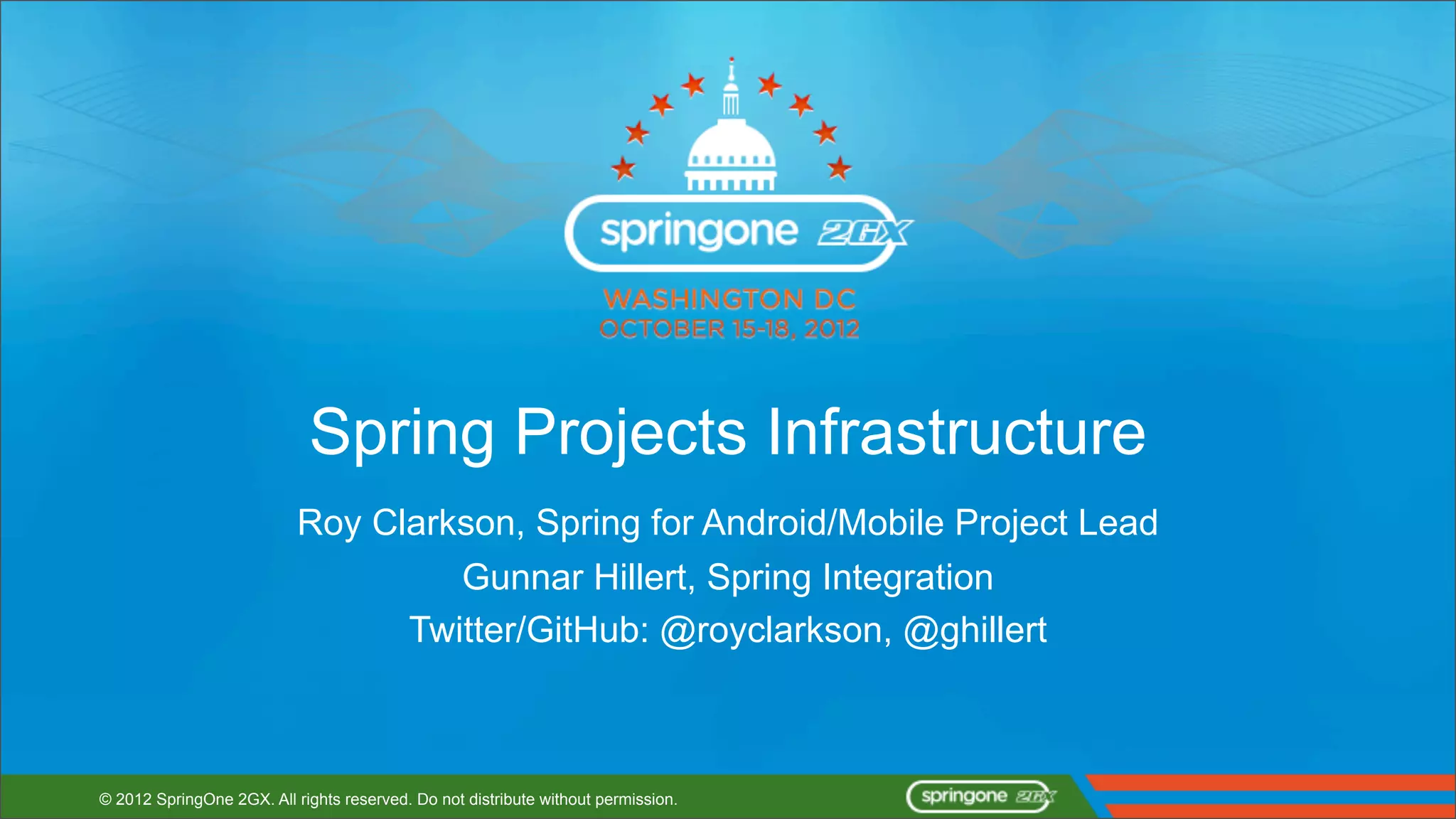 This document discusses Spring's infrastructure projects. It covers issue tracking with JIRA, building projects with Gradle, continuous integration with Bamboo, code quality metrics from Sonar, artifact hosting with Artifactory, source control on GitHub, and community contributions via code reviews. The presenters were Roy Clarkson and Gunnar Hillert from the Spring team.