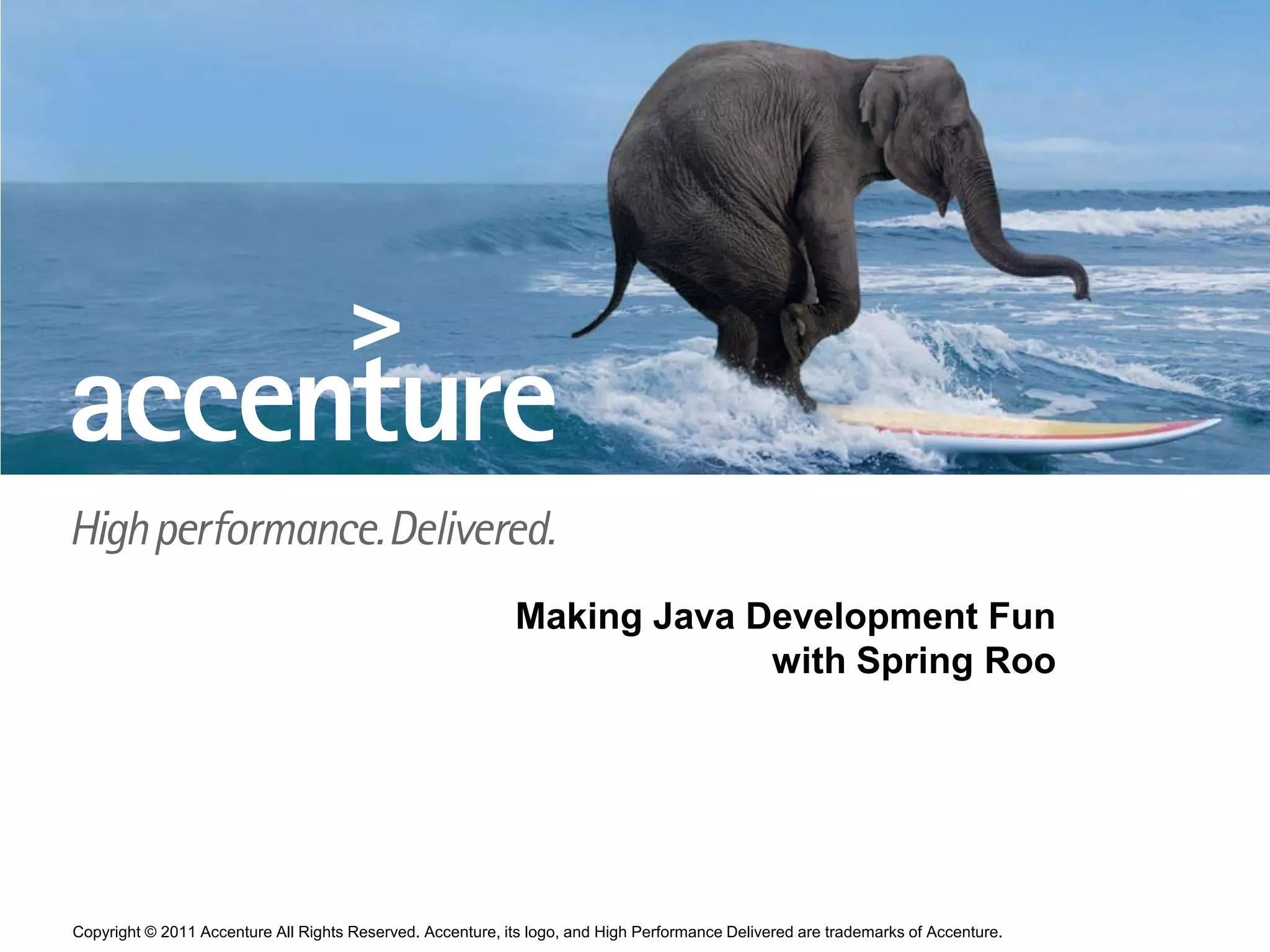 The document introduces Spring Roo, a tool that aims to make Java development fun by eliminating complexity, boosting productivity, and following principles like KISS and DRY. It discusses problems with traditional Java applications like complexity, lack of DRYness, and boilerplate code. Spring Roo uses simple commands, pragmatic code generation, and aspects to generate basic application structures and address these problems. The core components and development cycle are explained, and examples are provided of entities, controllers, and JSPX views that Roo can automatically generate.