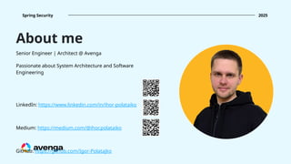 The document provides a detailed overview of Spring Security, focusing on its authentication mechanisms and customizations, including JWT and API key setups. It discusses the architecture, modularization of security configurations, and various authentication filters while emphasizing the importance of understanding the basics for effective implementation. Recommendations on when to use different setups and customizable points in Spring Security are also highlighted.