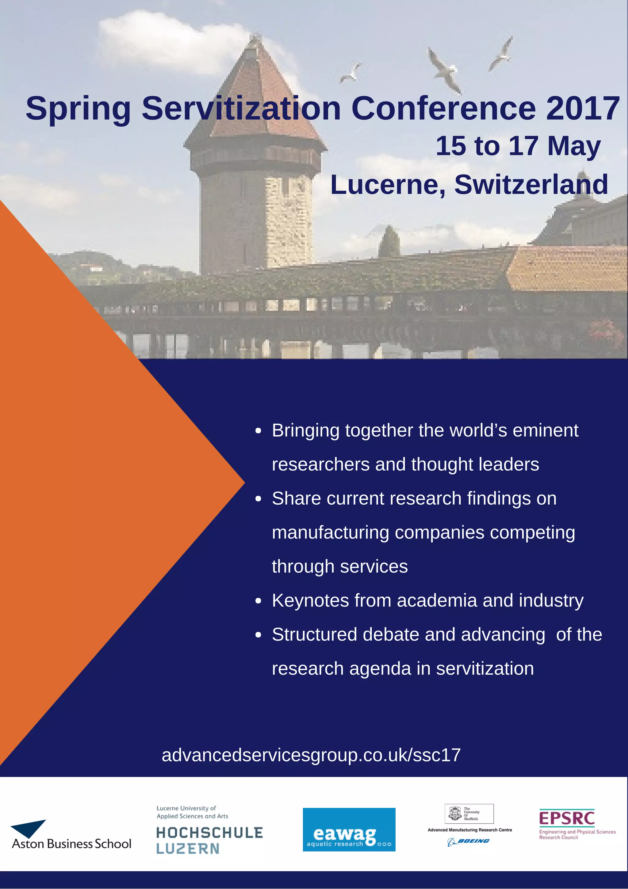 The document provides information about the Spring Servitization Conference 2017 taking place from May 15-17 in Lucerne, Switzerland. The conference will bring together researchers and thought leaders to share current findings on manufacturing companies competing through services and advance the research agenda in servitization. It lists the keynote speakers from academia and industry as well as details about the venues, registration information, and conference chairs.