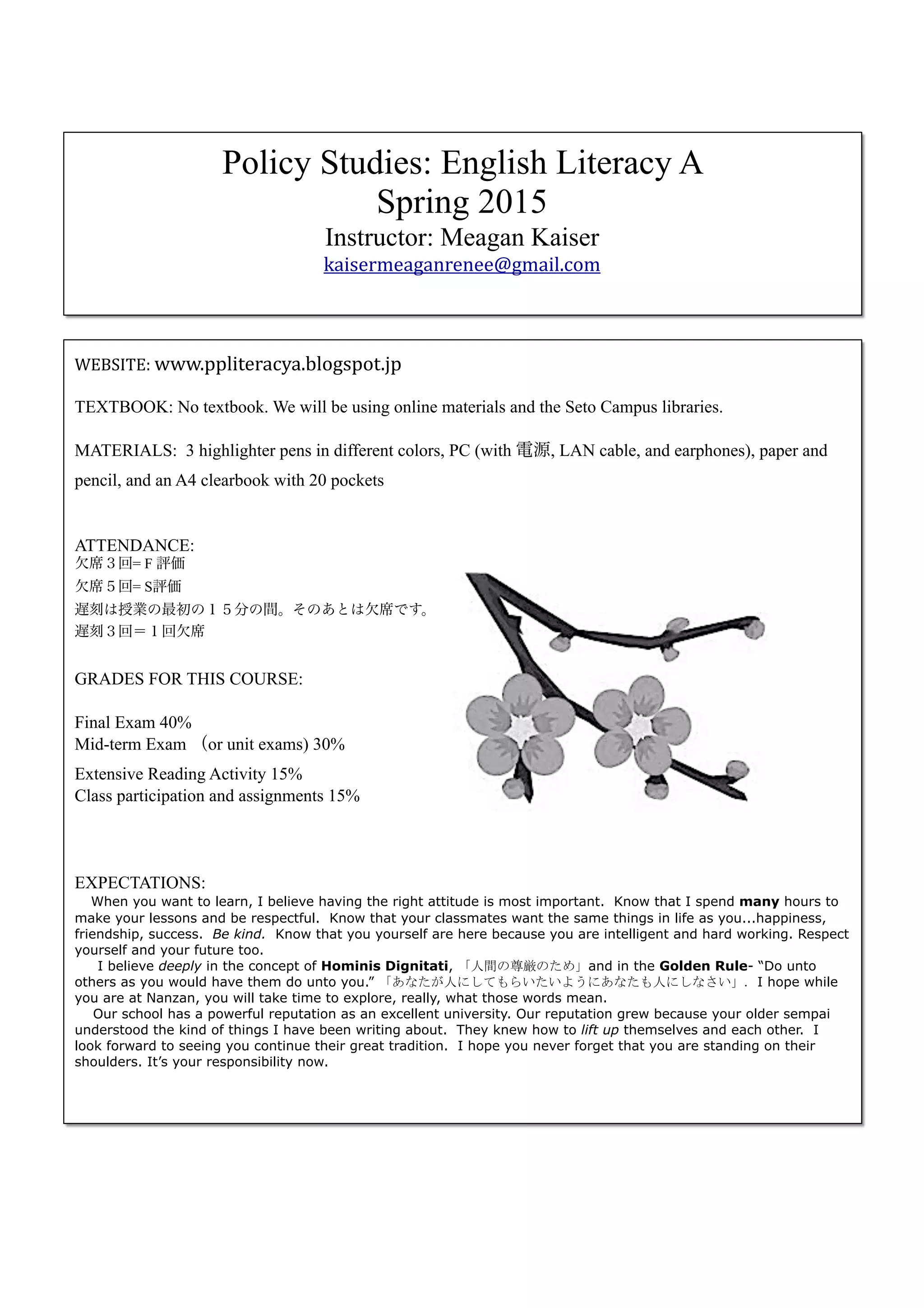 This document outlines the syllabus for an English literacy course at Seto Campus. The course will focus on developing English reading skills through analyzing TED Talks and completing book reports. Students will be graded based on their performance on a midterm exam, final exam, class participation and assignments, and an extensive reading activity. The instructor emphasizes the importance of having a positive attitude, treating others with respect, and continuing the school's reputation for excellence. Students are expected to attend regularly and be on time for class.