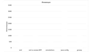 Документ содержит описание и детали работы с фреймворком Spring, включая его архитектуру, контексты и жизненный цикл бинов. В нем рассматриваются методы настройки бинов и производительность, а также примеры конфигурации с использованием Java и Groovy. Также обсуждаются аспекты производительности и сравнение различных подходов в разработке приложений на Spring.