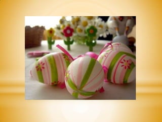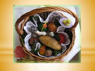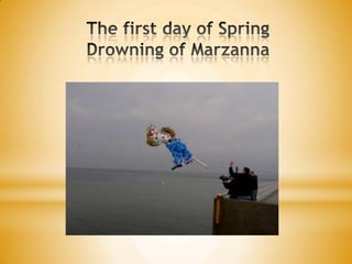 The document describes several spring holidays and traditions celebrated in Poland, including the drowning of Marzanna on the first day of spring, making palms and Easter eggs for Easter, decorating with flowers like catkins, narcissus, goldenrain and crocus, and celebrating Wet Monday after Easter with Easter baskets delivered by the Easter Bunny or Easter lamb.