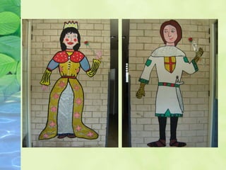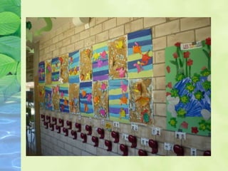The document lists the titles of several art projects created by students at Escola Mare de Déu de Montserrat in Súria, Spain. The projects include paintings and drawings titled "Flowers and Dragons", "Saint George and the Princess", and several works featuring turtles such as "Turtles on the Sand", "Our Window Under the Sea", and "Funny Turtles".