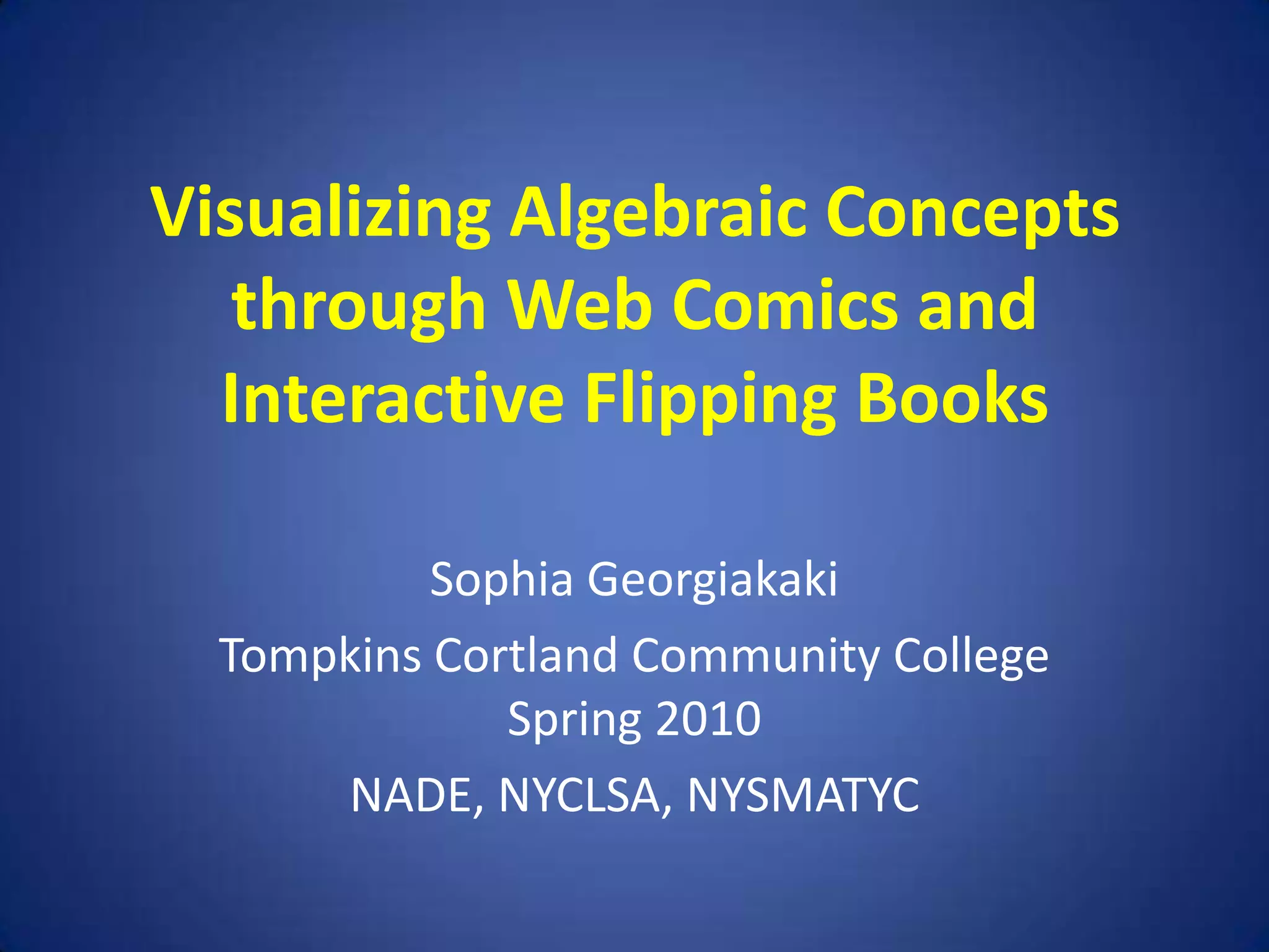 This document discusses using technology to create interactive study materials for students. It begins by describing the hardware and software used, including a tablet PC for taking lecture notes and converting them to PDF. It then discusses creating videos of problem solving using screencasting software and embedding them in notes on the online learning system. The document expresses a vision for creating interactive "flip books" using software that allows combining notes, videos, hyperlinks, and assessments. It describes trialing software called Flip Is Art that enables this, and also proposes having students create their own comic book style study materials using Web Comic Book Creator software.
