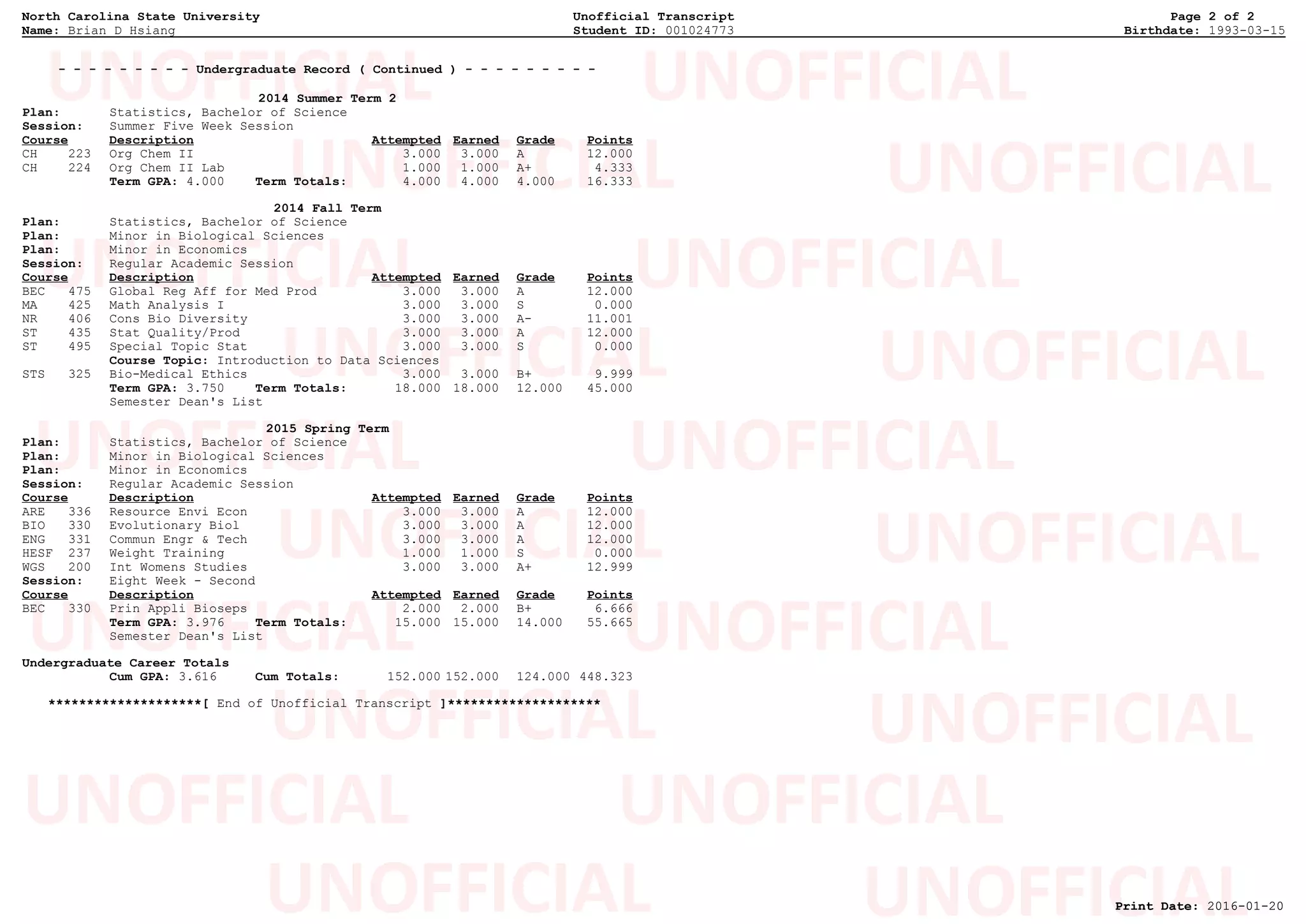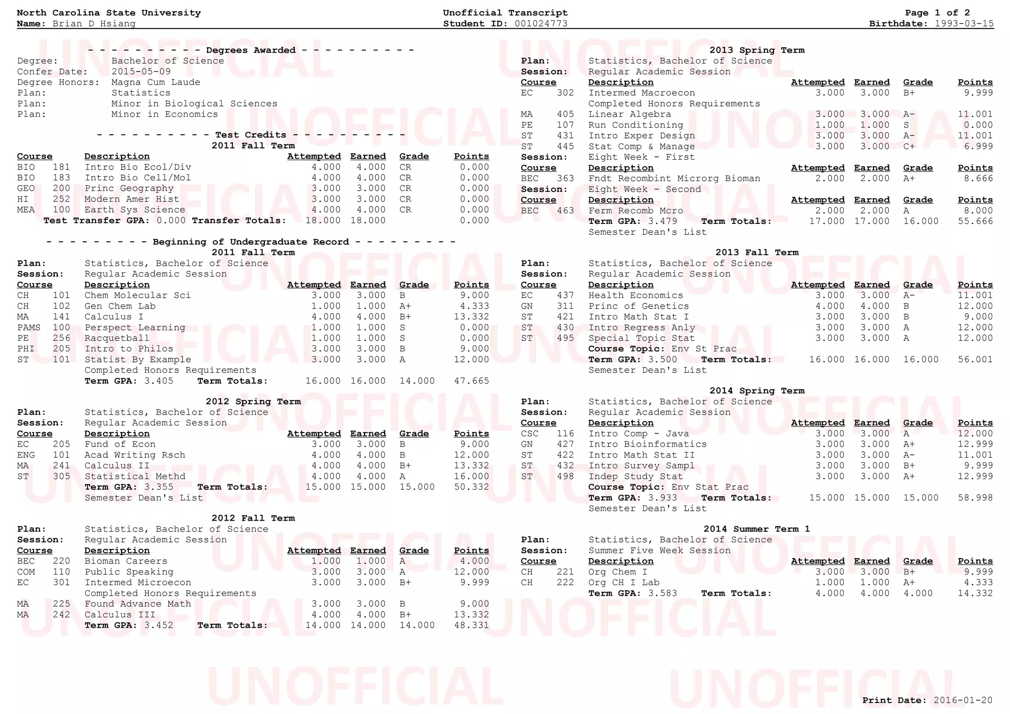 - The transcript shows his coursework and grades from 2011-2015, including maintaining a high GPA each semester and earning Dean's List honors multiple times.