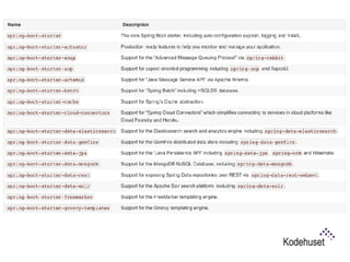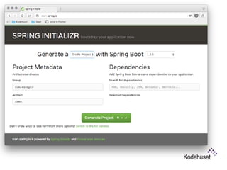 Spring Boot makes it easy to create stand-alone, production-grade Spring applications without needing to deploy files. It provides starter dependencies to simplify configuration, performs automatic configuration, and includes production-ready features like metrics and health checks. This document demonstrates creating a RESTful web service using Spring Boot with Groovy and Gradle by developing an application to manage an RC car registry in 9 steps, covering creating the application, executable JAR, configuration, endpoints, testing, security, and actuators. New features in Spring Boot 1.4 include startup failure analysis, updated dependencies and test annotations, and image banners.