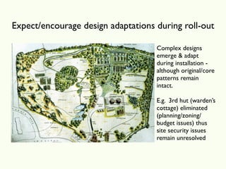 The document outlines a community-focused project involving design adaptations during installation, acknowledging challenges such as budget issues and site security. It highlights various elements, from ecological building practices to local engagement in gardening, aimed at improving community health. Additionally, it discusses safety considerations, risk management, and innovative solutions to enhance the project while preserving the environment.