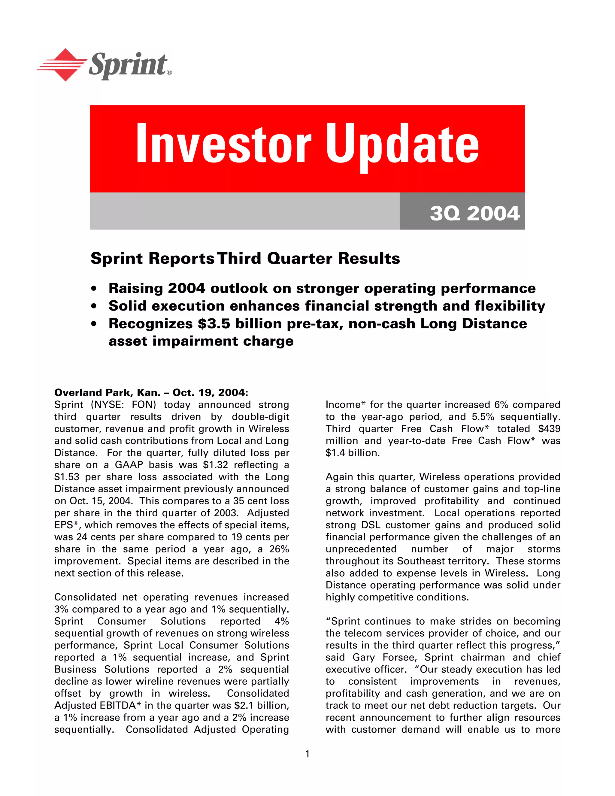 Sprint reported third quarter results with increases in revenue, profit, and customer growth in wireless and solid cash flow. Wireless saw double-digit revenue and profit growth along with customer gains. Local operations reported strong DSL customer additions despite challenges from storms. Sprint recognized a $3.5 billion impairment charge for its long distance assets. It raised full-year guidance due to stronger performance and execution that has enhanced financial strength and flexibility.