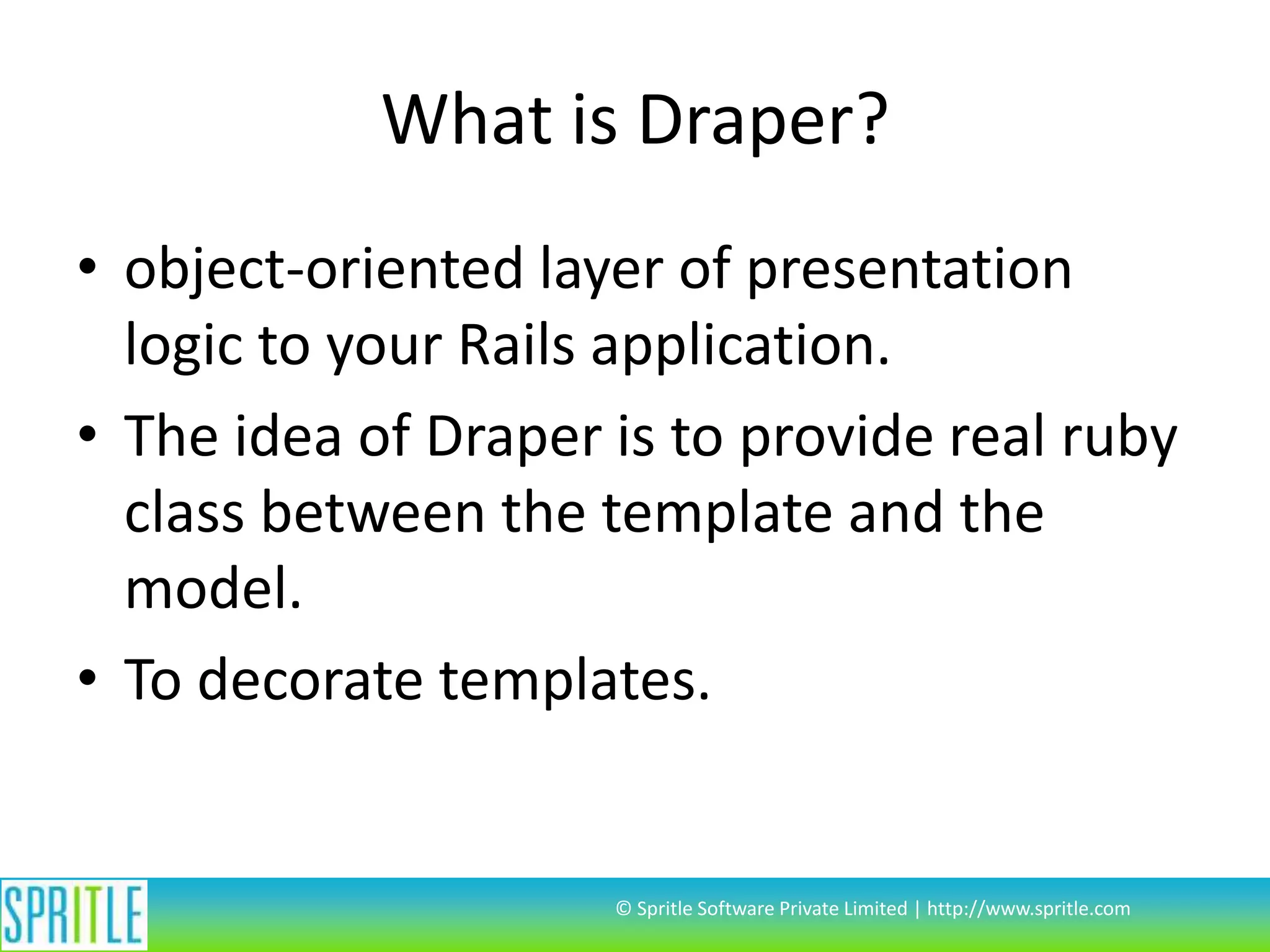 Draper is an object-oriented layer that sits between view templates and models in Rails applications. It uses decorator objects to clean up complex view logic, provide a more object-oriented way to bundle view code, and make view code easier to test and maintain. The decorator pattern allows adding behavior to individual objects without affecting other objects, and Draper generators can be used to easily create decorators for models.
