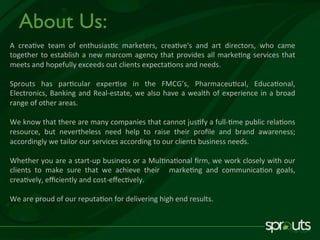 This agency profile summarizes an agency called Sprouts that provides marketing services across various industries. It has expertise in FMCG, pharmaceutical, education, electronics, banking, and real estate. The agency aims to offer top-quality, innovative communication solutions through value-adding client relationships and long-term business partnerships. Its vision is to be the number one choice for enhancing customer business value through integrated marketing solutions. The agency delivers a wide range of marketing deliverables and services including design, media, research, production, and event management.