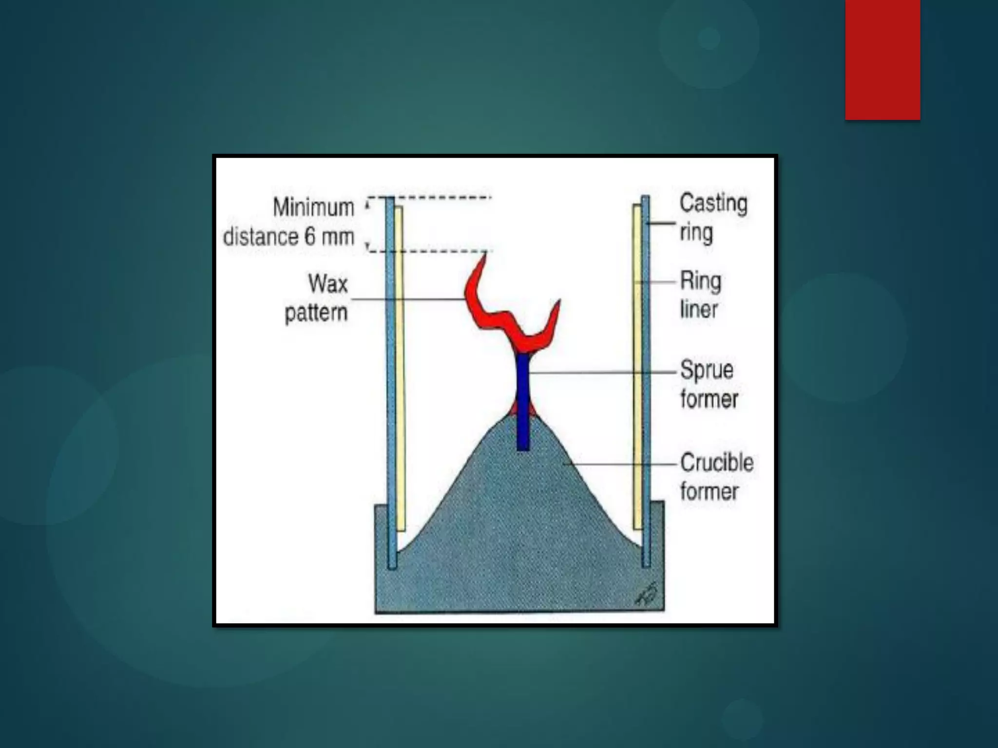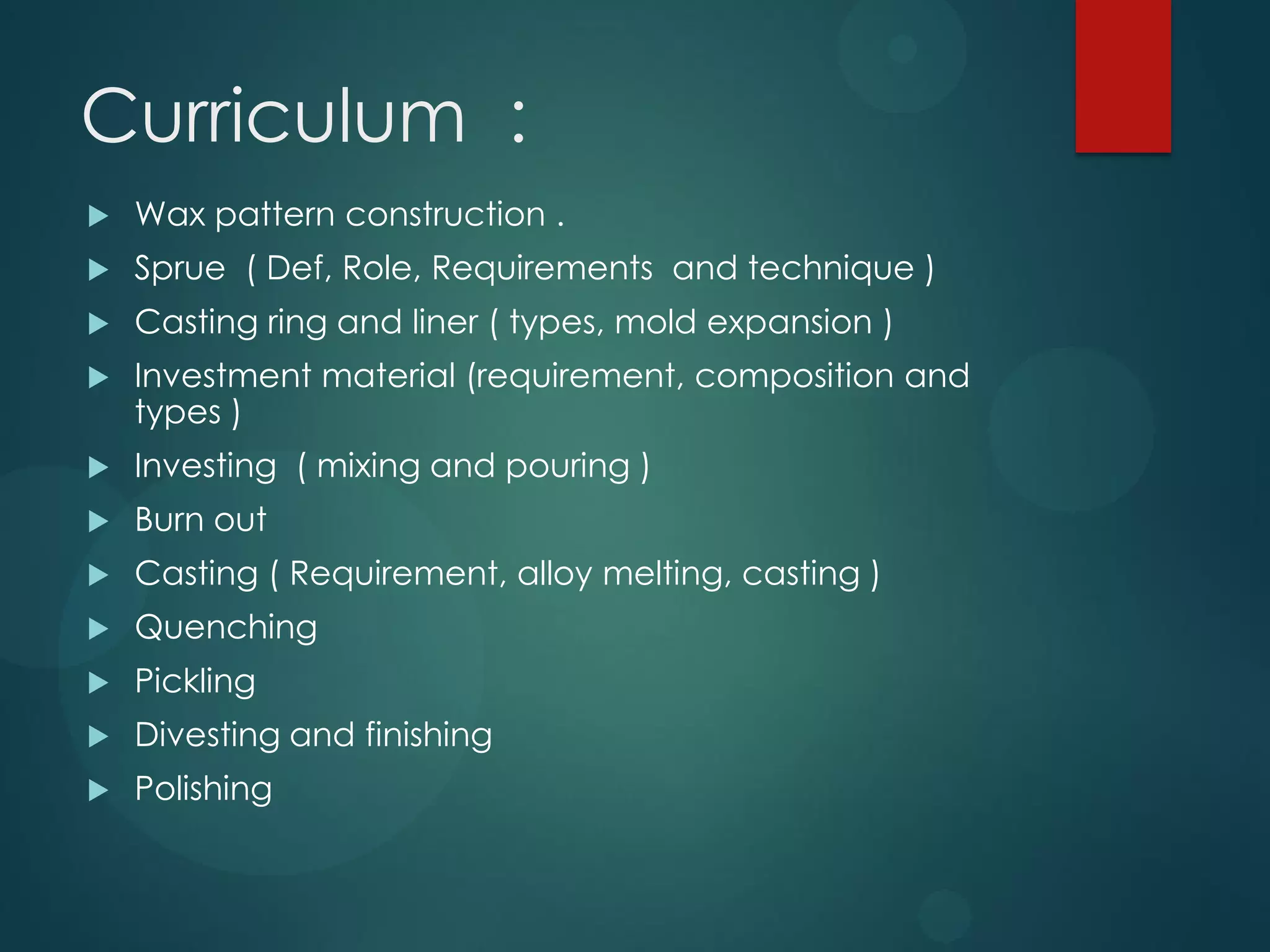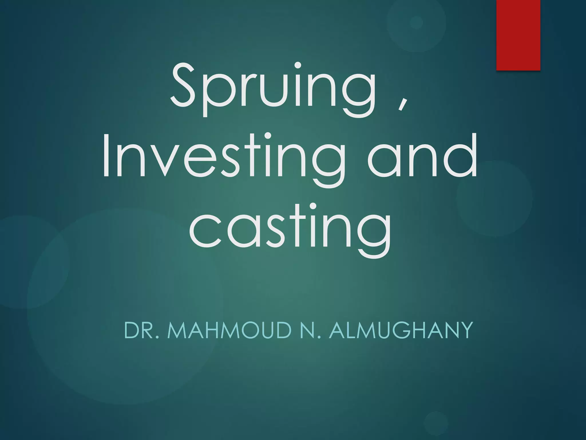 The document provides an overview of the process of spruing, investing, and casting. It discusses constructing a wax pattern, creating a sprue to allow molten metal to flow into the mold, using a casting ring and liner to contain the investment material. It also covers investing materials, the investing process, burnout to eliminate wax, casting including melting alloys and techniques, quenching, pickling, divesting, and finishing processes like polishing. The overall process involves surrounding a wax pattern with a refractory investment material, heating to remove wax, and introducing molten metal to create a dental restoration.