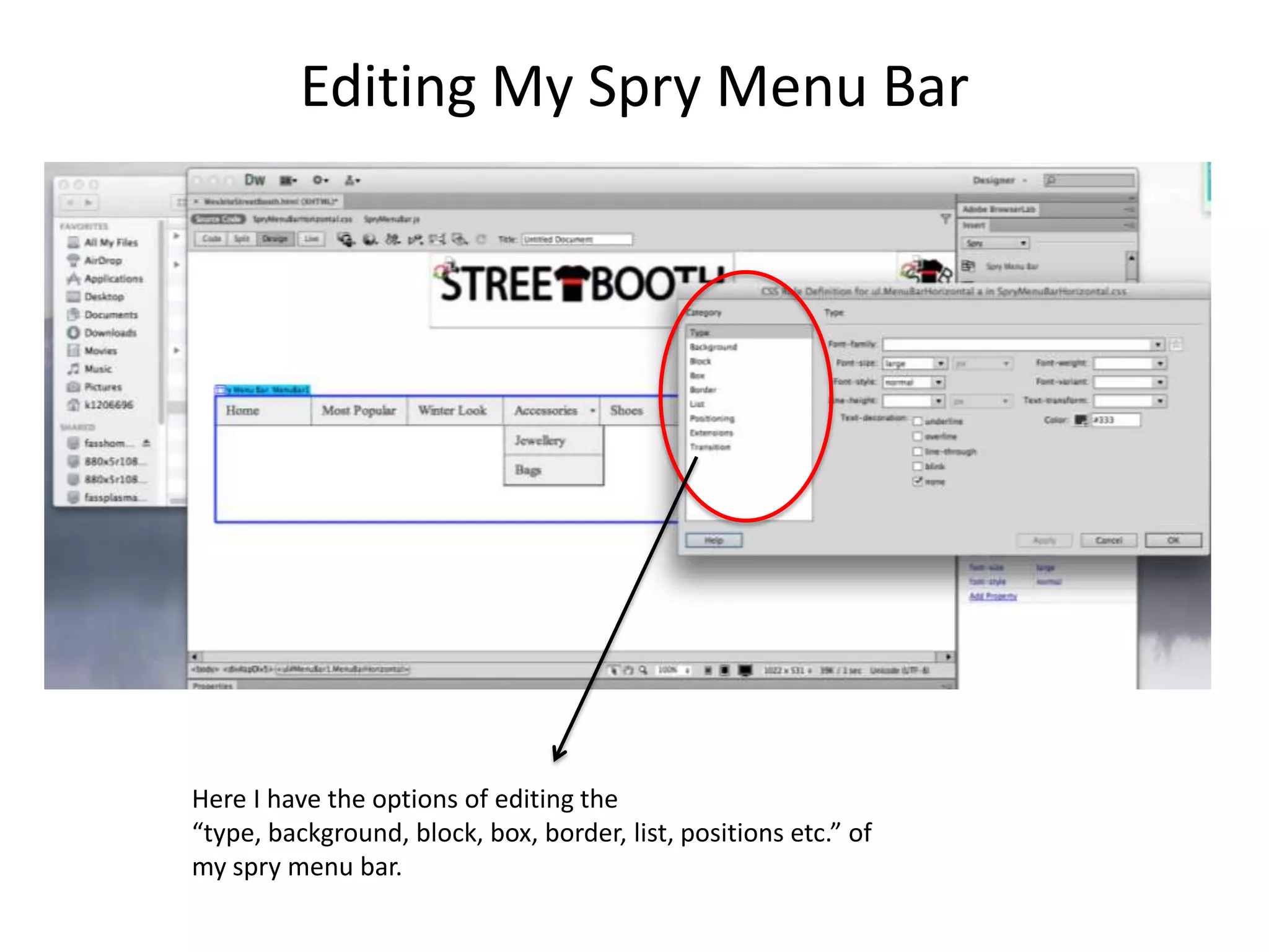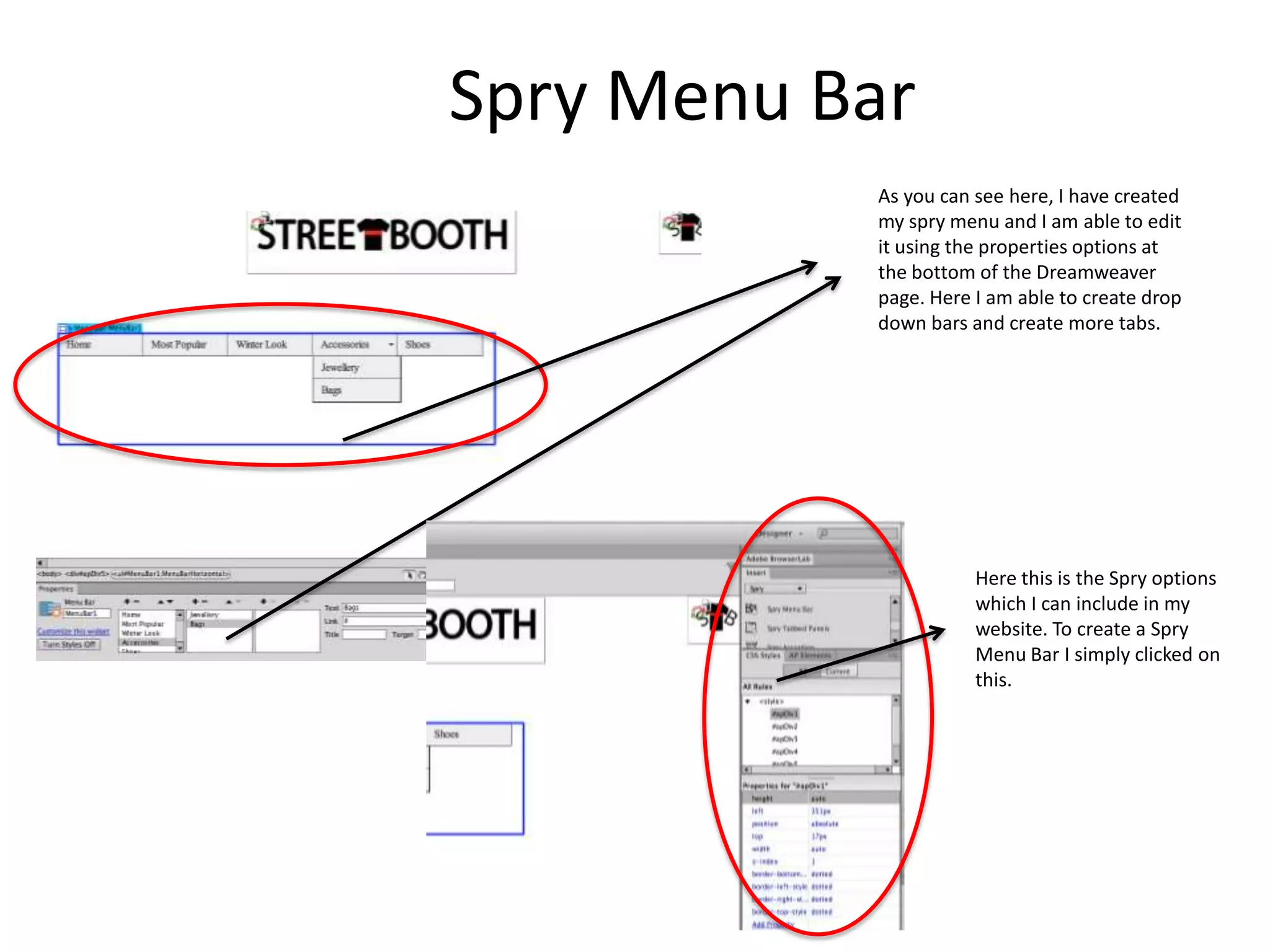 Spry Menu Bar allows for editing menu options in Dreamweaver. Properties at the bottom can be used to create drop down bars and additional tabs. The Spry options allow inclusion of menus on websites. Editing options for the menu bar include type, background, borders, positioning and more. Color can be customized, like changing the hover color to red for branding consistency.