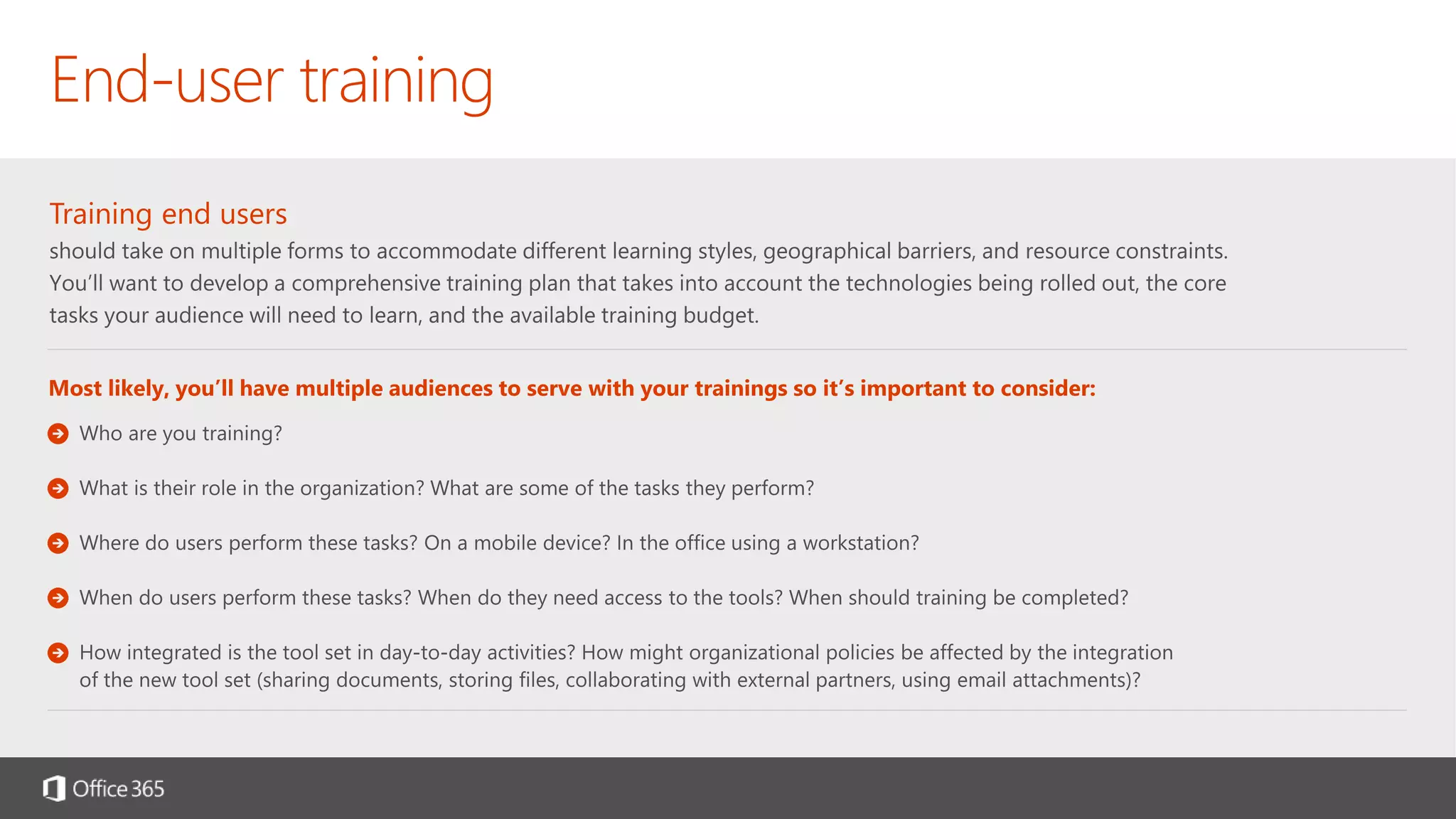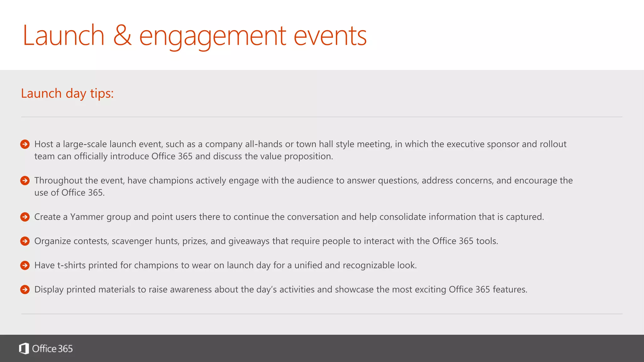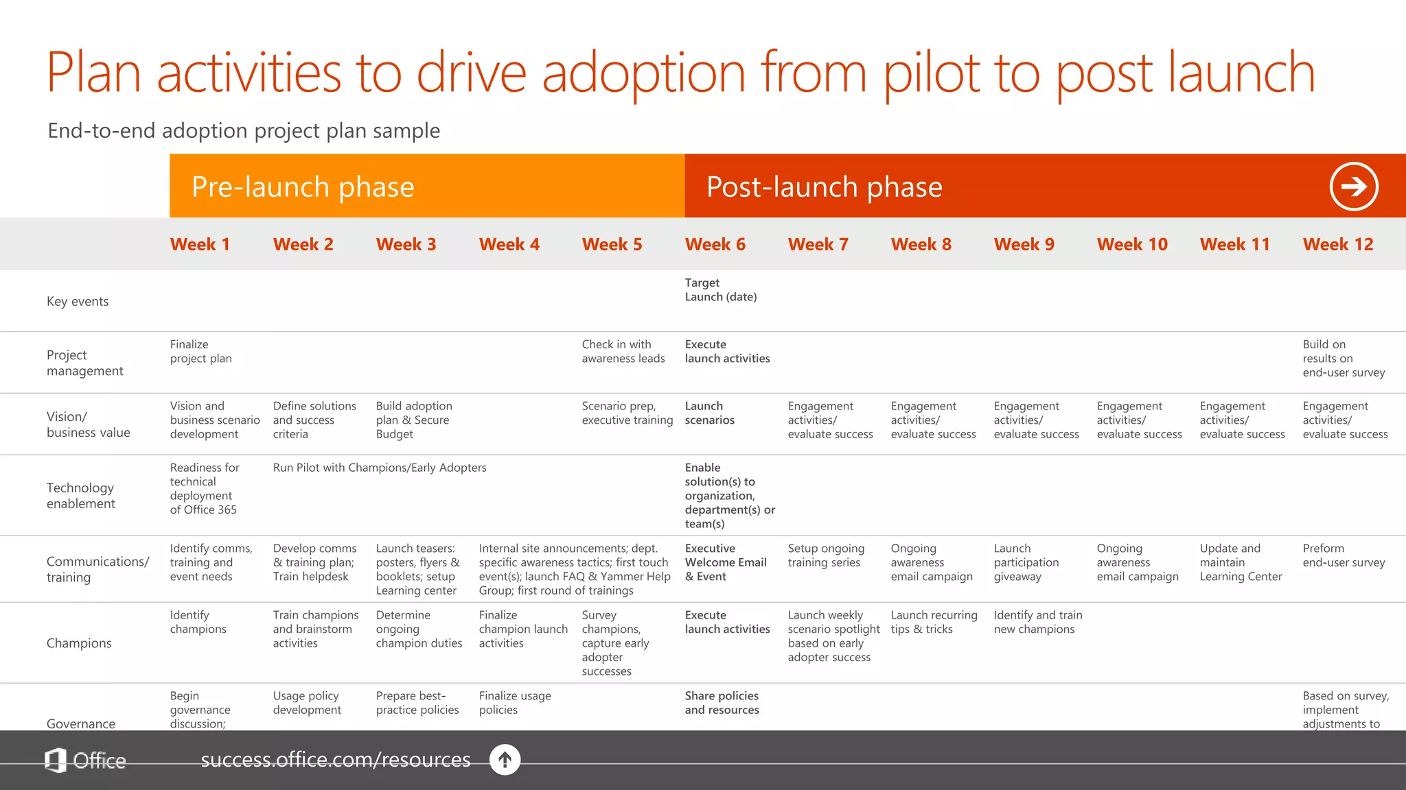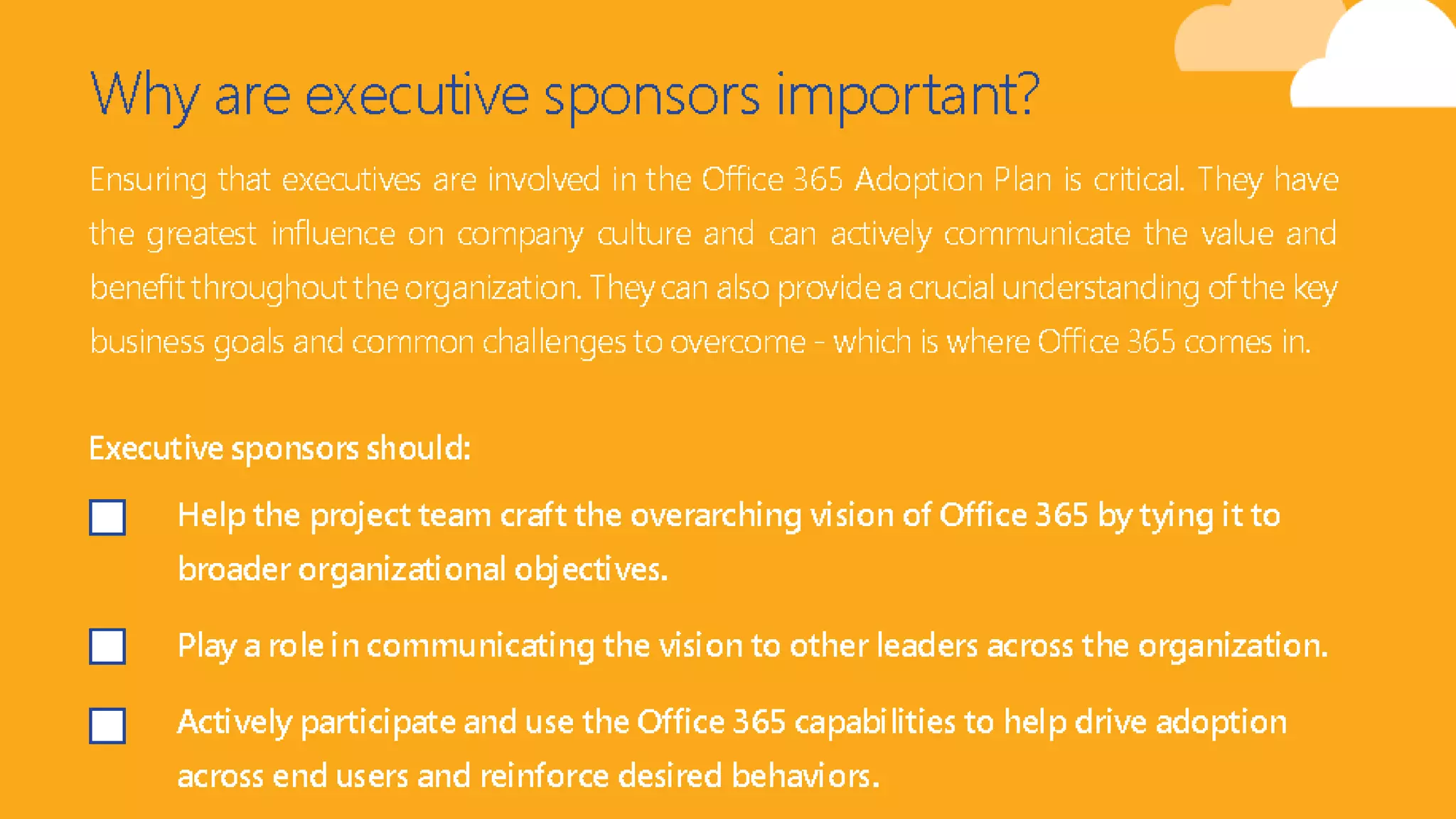 This document outlines strategies for driving adoption of SharePoint and Office 365 through an end user adoption program. It recommends defining a vision and use cases, gaining executive sponsorship, identifying champions, implementing phased releases with end user training, leveraging experts, using gamification to make it fun, measuring success, and iterating based on feedback. Key resources mentioned include the Microsoft Fast Track program and adoption checklist, as well as experts in the field. The overall message is that adoption depends on a strategic, people-focused program to communicate value and make the tools easy to use.