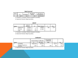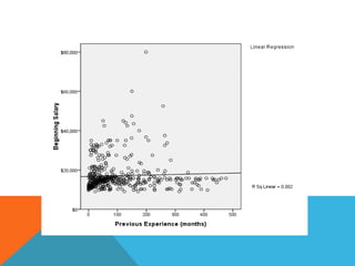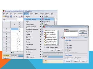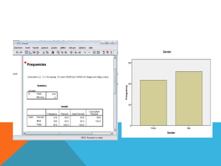 This document provides an overview of using the SPSS statistical package for data analysis. It discusses the four main windows in SPSS - the data editor, output viewer, syntax editor, and script window. It also covers the basics of managing data files, including opening SPSS, defining variables, and saving data. Finally, it introduces some basic analysis techniques in SPSS like frequencies, descriptives, and linear regression analysis.