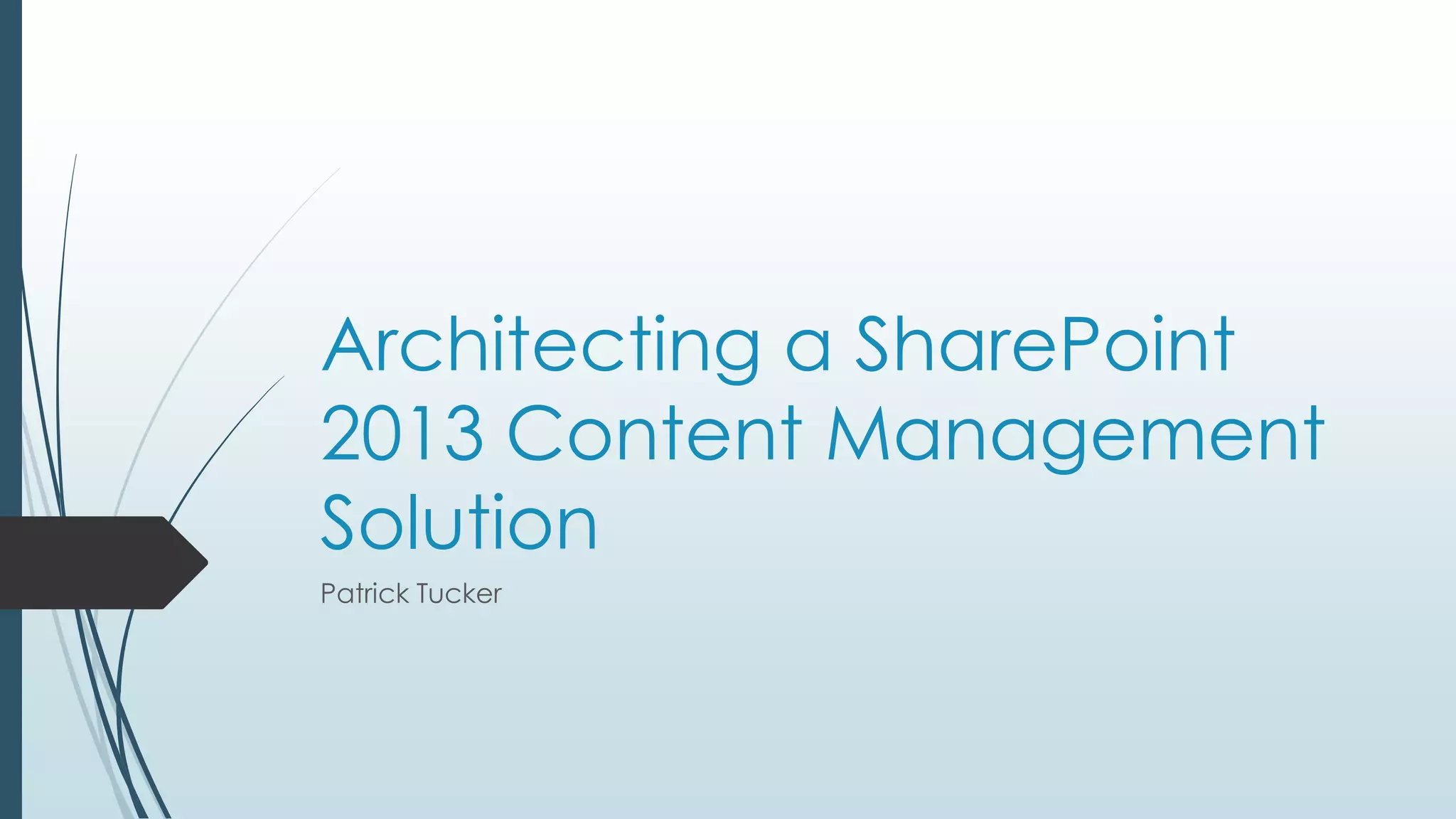 This document summarizes Patrick Tucker's presentation on architecting a SharePoint 2013 content management solution. It discusses defining and organizing content through tools like content types, metadata, and taxonomies. It also covers tracking and routing content with features like the content organizer and document ID service. Finally, it discusses management and retention of content through policies, holds, records management, and eDiscovery tools in SharePoint 2013.