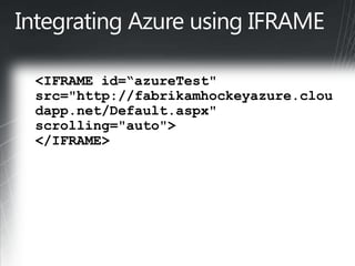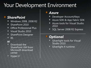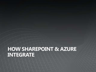 This document provides an overview and summary of SharePoint 2010 and its integration with Windows Azure. The session is divided into discussing SharePoint 2010, its development tools, Windows Azure, and how SharePoint 2010 can integrate with Windows Azure. Several demos are provided showing how SharePoint artifacts like web parts, workflows, and BCS can interact with and leverage data and services hosted on Windows Azure. The benefits, challenges, and different approaches for integrating SharePoint and Azure are also reviewed.
