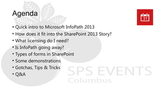 This document provides information from a SharePoint Saturday event. It includes instructions for attendees, thanks to event sponsors, and a poll for where attendees should meet afterwards. It also includes background on the speaker and slides from their presentation on using InfoPath forms with SharePoint.