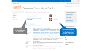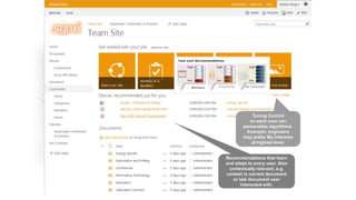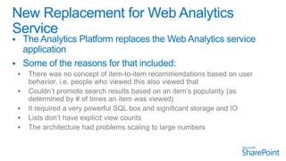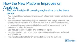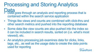 The document discusses advanced analytics processing techniques for enhancing search functionalities, focusing on aspects like anchor text processing, click distance, search clicks, and social tags. It details how these analyses boost or demote items in the search index based on user interactions and relationships among users. Additionally, it emphasizes machine learning and personalization to improve user experience and recommendations in SharePoint.