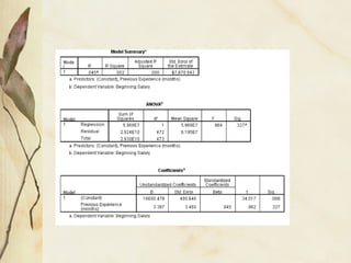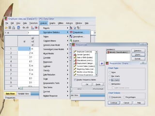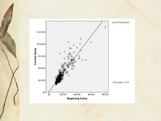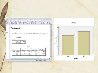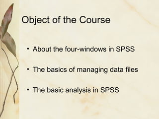 This document provides an overview of using the statistical software package SPSS. It discusses the four main windows in SPSS - the data editor, output viewer, syntax editor, and script window. It also covers the basics of managing data files, including opening SPSS, defining variables, and saving data. Finally, it demonstrates some common analyses in SPSS including frequencies, descriptives, and linear regression as well as how to interpret the outputs and plot regression lines. The overall purpose is to introduce the basics of using SPSS to perform statistical analysis and data management.