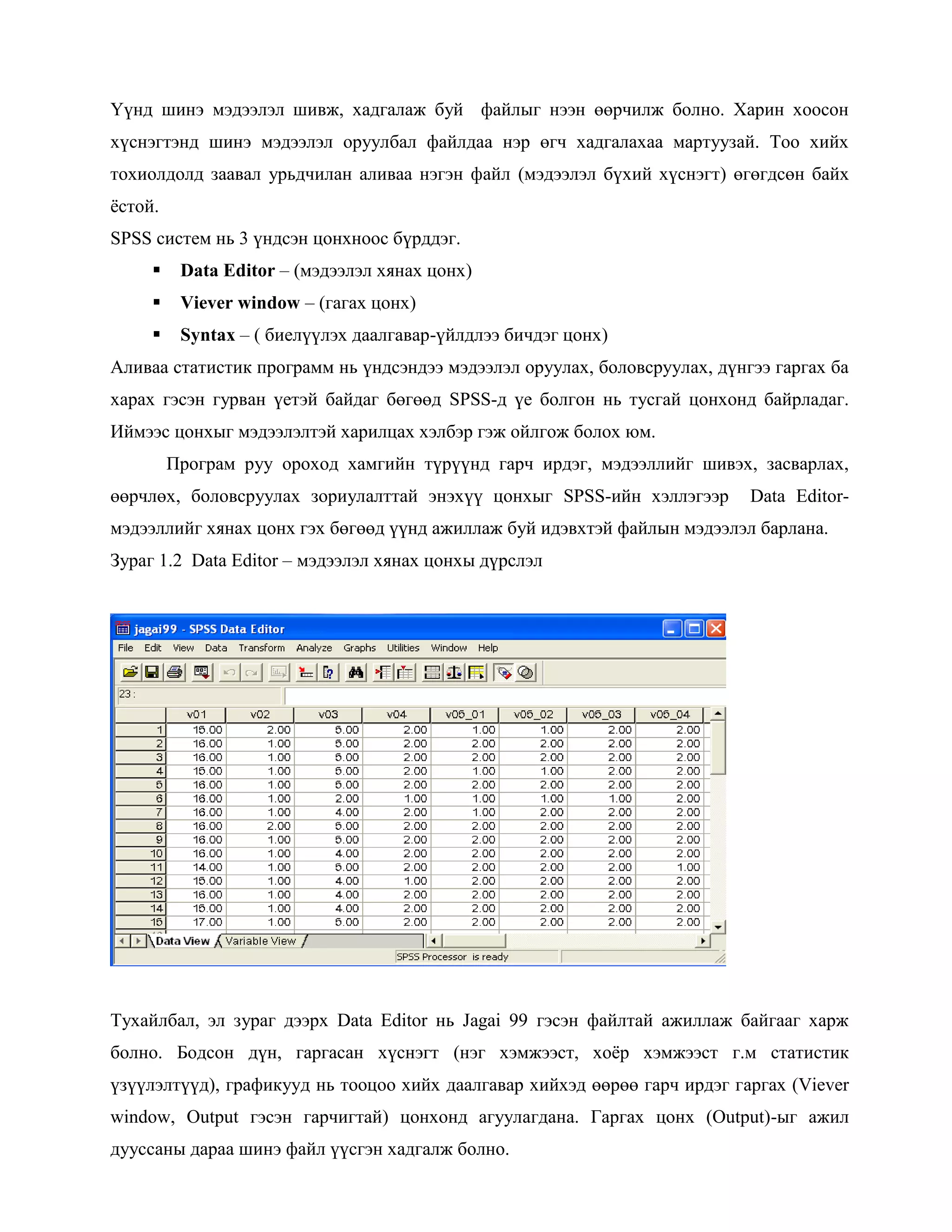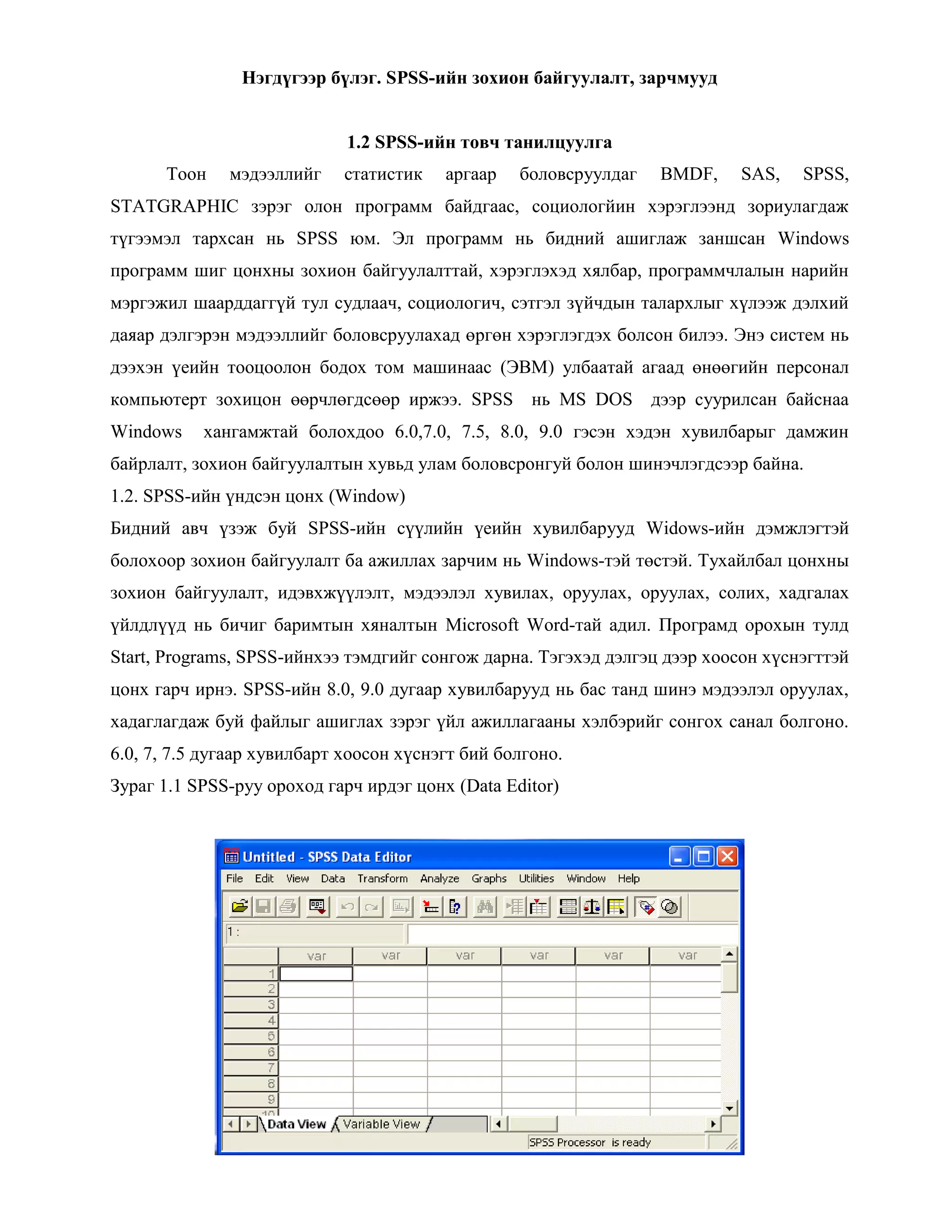 нь хосын, хэсгийн корреляцийн коэффициент, зайн функцийг бодож учир холбогдлын түвшинг заадаг. Корреляцийн матрицыг бусад горим, тухайлбал кластер болон хүчин зүйлийн шинжилгээнд ашиглаж болно. REGRESSION - Шулуун болон муруй шугаман регрессийн тэгшитгэл байгуулж, тохирох статистикийг бодно. PROBIT - Нэг буюу хэдэн хувьсах хэмжигдэхүүнүүд дихотоми хувьсагчид нөлөөлөх байдлыг үнэлж, Логистик регрессийн загвар байгуулна. DESCRIPTIVES - нь Frequencies горимтой төстэй боловч стандарт хувьсагчийг олдог, бас тасралтгүй хувьсагчлын статистик бодоход илүү үр нөлөөтэй байдаг онцлогтой. DISCRIMINANT - Ажиглалтын хоѐр юмуу түүнээс илүү бүлгийн хоорондох ялгааг олоход хэрэглэдэг хувьсагчийн шугаман хослолын статистик арга техник. FACTOR - Хүчин зүйлийн шинжилгээний алгоритмыг хэрэгжүүлэх горим. LOGLINEAR - Нэрлэсэн шкал бүхий хувьсагчдын гол бүрдүүлэгч болгодог аливаа загварын параметрийг үнэлэхэд хэрэглэдэг, логарифмын шугаман шинжилгээний ерөнхий горим. Plot - Хувьсагчийн хоѐр хэмжээст тархалтын графикаар дүрслэхэд хэрэглэдэг горим. Ном зүй 1. Черенков А.А “Основы статистического анализа в программнрй системе SPSS”, Москва.,1994 2. Ростегаева Н.И. “Введенив в использование системы для статистического анализа социологических данных - SPSS”, M.,1990. 3. “SPSS Base 8.0 Applications Guide”, Chicago.,1998. 4. “SPSS Base 8.0 User‟s Guite”, Chicago.,1998.