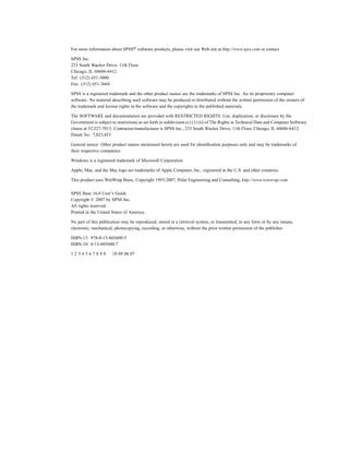 SPSS 16.0 is a software for statistical analysis that can analyze data from various sources and generate reports, charts, descriptive statistics, and complex statistical analyses. It includes procedures for regression, advanced models, tables, time series analysis, and more. The manual describes the graphical user interface of SPSS 16.0 Base and additional options are available as add-ons. Customer support and training is available from SPSS.