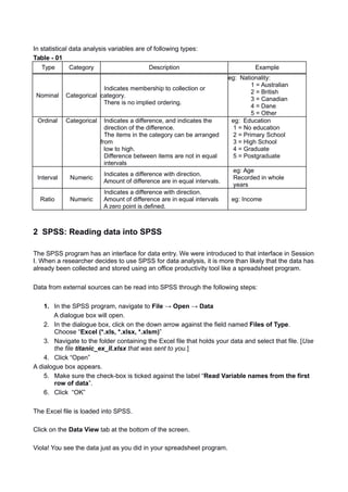 This document provides an overview of describing data in SPSS. It discusses types of variables, including nominal, ordinal, interval, and ratio variables. It then explains how to import data from Excel into SPSS and view it. Key steps include selecting the file type, reading variable names from the first row, and viewing the data and variable views. The document outlines defining variable properties such as name, type, label, values, and roles. It describes editing these properties in the variable view or using the define variable properties window. Finally, it mentions inspecting the data through frequency distributions before analysis.