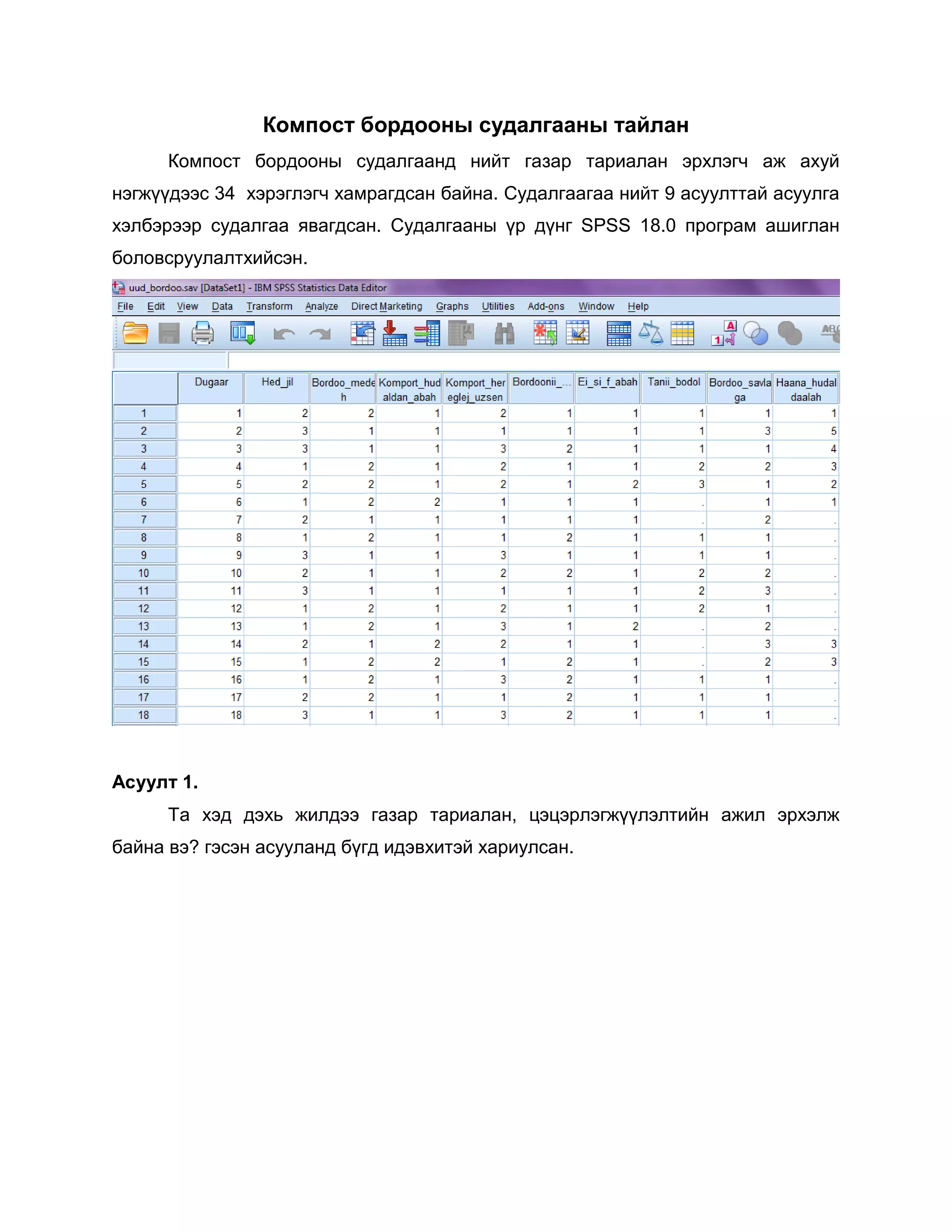 хэлбэрээр судалгаа явагдсан. Судалгааны үр дүнг SPSS 18.0 програм ашиглан
