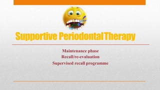 1. Supportive periodontal therapy (SPT) involves procedures performed at regular intervals to help patients maintain oral health after initial periodontal treatment. The goals of SPT include preventing recurrence of periodontal disease and reducing tooth loss through ongoing monitoring.