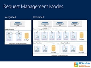 This document discusses performance enhancements in SharePoint 2013, including distributed cache, shredded storage, request management, and user interface fundamentals. It provides guidance on configuring the distributed cache and request management systems for farms of different sizes. Key aspects covered are recommended cache sizes, minimum cache hosts, counters for monitoring performance, and demos of configuring each system.