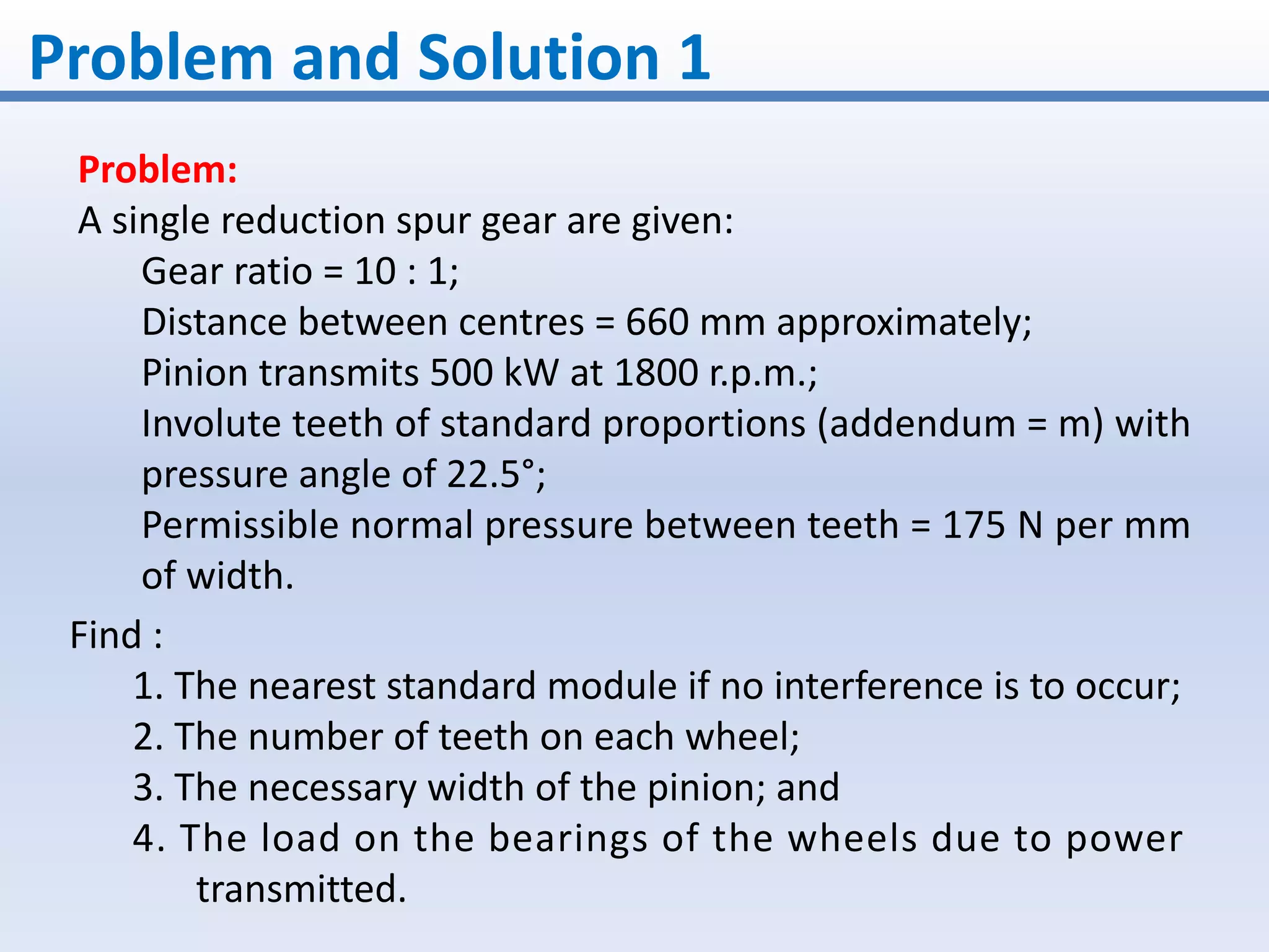 This problem involves designing a gear drive system to meet specific power, speed, and ratio requirements.